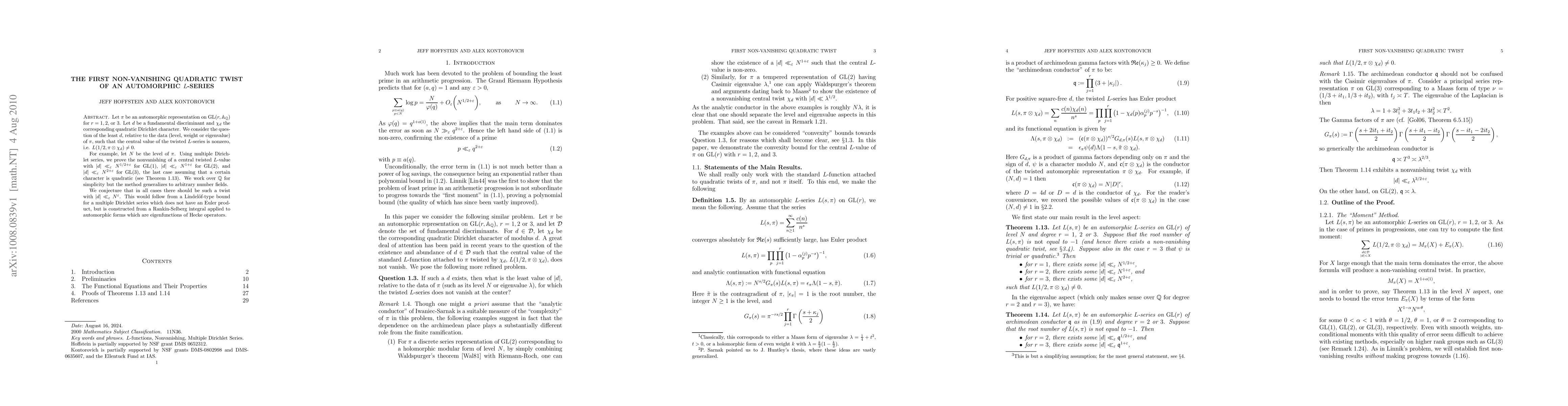 Let pi be an automorphic representation on GL(r, A_Q) for r=1, 2, or 3. Let d be a fundamental discriminant and chi_d the corresponding quadratic Dirichlet character. We consider the question of the least d, relative to the data (level, weight or eigenvalue) of pi, such that the central value of the twisted L-series is nonzero, i.e. L(1/2, pi x chi_d) != 0. For example, let N be the level of pi. Using multiple Dirichlet series, we prove the nonvanishing of a central twisted $L$-value with d << N^{1/2} for GL(1), d << N^1 for GL(2), and d << N^2 for GL(3), the last case assuming that a certain character is quadratic (see Theorem 1.13). We work over Q for simplicity but the method generalizes to arbitrary number fields. We conjecture that in all cases there should be such a twist with d << N^epsilon. This would follow from a Lindelof-type bound for a multiple Dirichlet series which does not have an Euler product, but is constructed from a Rankin-Selberg integral applied to automorphic forms which are eigenfunctions of Hecke operators.