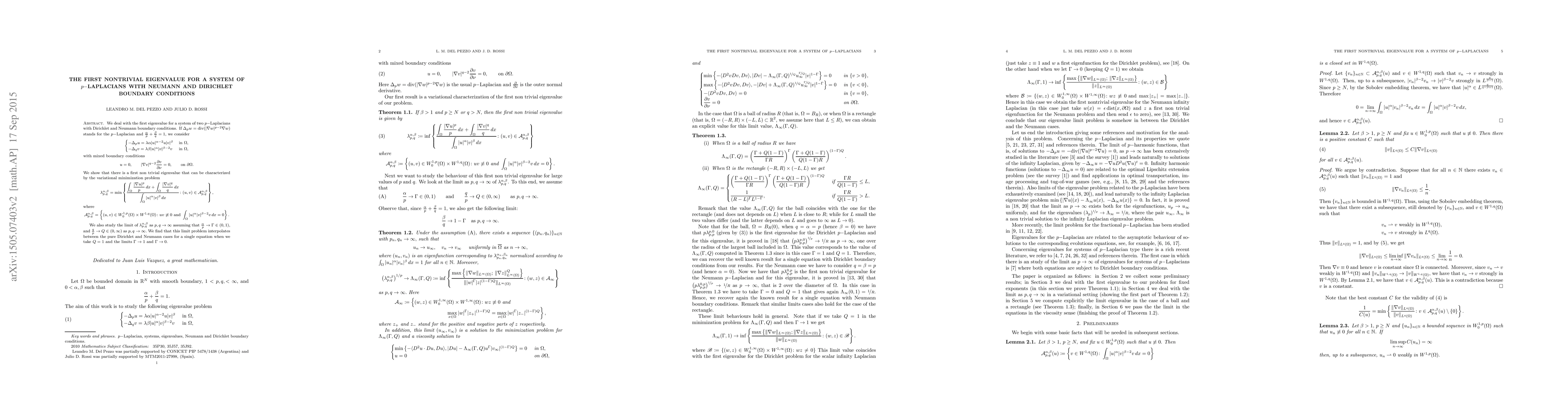 This paper investigates the first nontrivial eigenvalue for a system of two $p-$Laplacians with mixed boundary conditions. It characterizes the eigenvalue through a variational minimization problem and explores its behavior as $p$ and $q$ approach infinity.