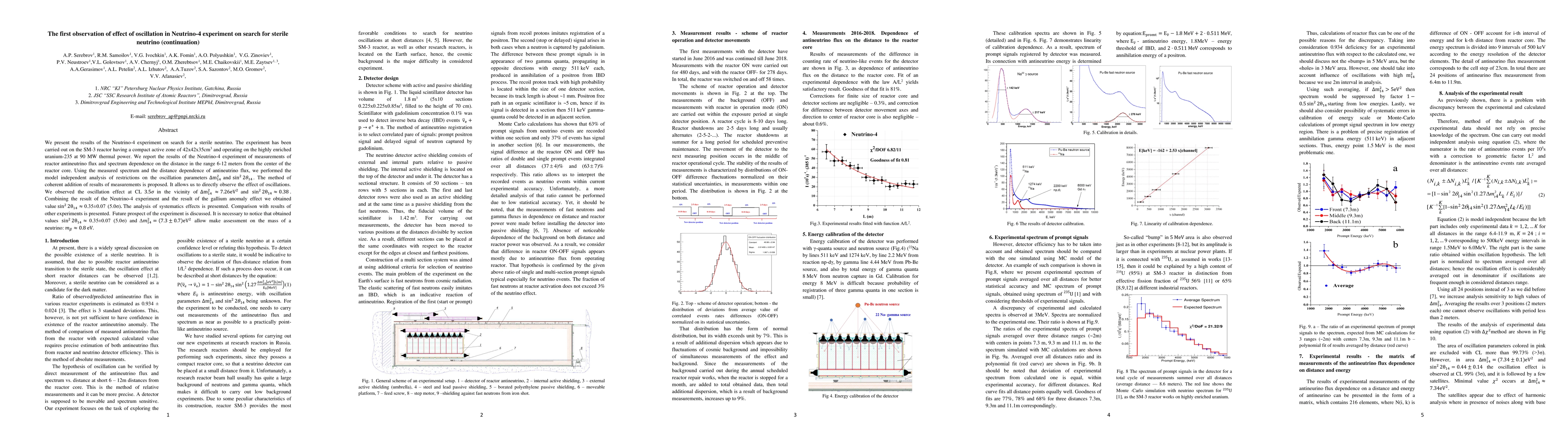 We present the results of the Neutrino-4 experiment on search for a sterile neutrino. The experiment has been carried out on the SM-3 reactor having a compact active zone of $42\times42\times35\textrm{cm}^3$ and operating on the highly enriched uranium-235 at 90 MW thermal power. We report the results of the Neutrino-4 experiment of measurements of reactor antineutrino flux and spectrum dependence on the distance in the range 6-12 meters from the center of the reactor core. Using the measured spectrum and the distance dependence of antineutrino flux, we performed the model independent analysis of restrictions on the oscillation parameters $\Delta m^2_{14}$ and $\sin^2 2\theta_{14}$. The method of coherent addition of results of measurements is proposed. It allows us to directly observe the effect of oscillations. We observed the oscillation effect at CL $3.5\sigma$ in the vicinity of $\Delta m^2_{14} \approx 7.26\textrm{eV}^2$ and $\sin^2 2\theta_{14} \approx 0.38$. Combining the result of the Neutrino-4 experiment and the result of the gallium anomaly effect we obtained value $\sin^2 2\theta_{14} \approx 0.35 \pm 0.07 (5\sigma)$. The analysis of systematics effects is presented. Comparison with results of other experiments is presented. Future prospect of the experiment is discussed. It is necessary to notice that obtained values $\sin^2 2\theta_{14} \approx 0.35 \pm 0.07 (5\sigma)$ and $\Delta m^2_{14} \approx (7.3 \pm 0.7)\textrm{eV}^2$ allow make assessment on the mass of a neutrino: $m_{\beta} \approx 0.8\textrm{eV}$.