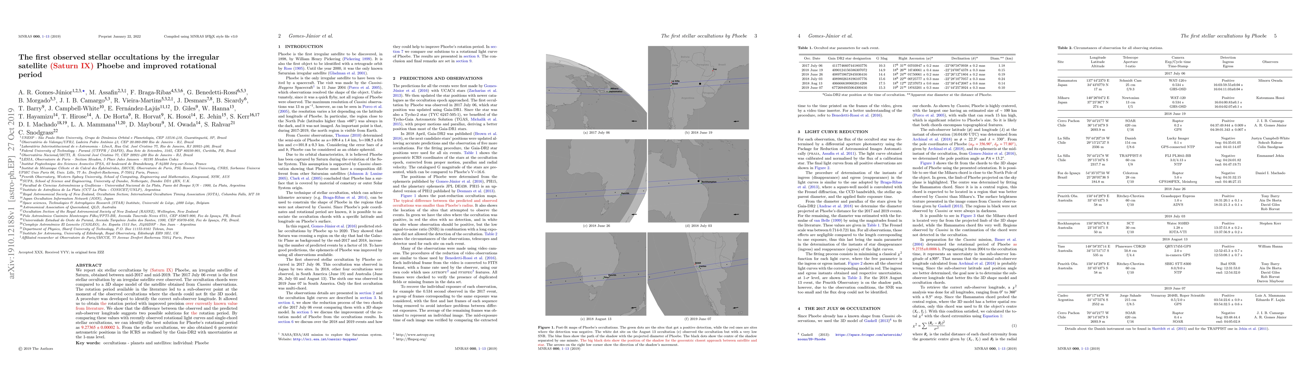 We report six stellar occultations by (Saturn IX) Phoebe, an irregular satellite of Saturn, obtained between mid-2017 and mid-2019. The 2017 July 06 event is the first stellar occultation by an irregular satellite ever observed. The occultation chords were compared to a 3D shape model of the satellite obtained from Cassini observations. The rotation period available in the literature led to a sub-observer point at the moment of the observed occultations where the chords could not fit the 3D model. A procedure was developed to identify the correct sub-observer longitude. It allowed us to obtain the rotation period with improved precision over currently known value from literature. We show that the difference between the observed and the predicted sub-observer longitude suggests two possible solutions for the rotation period. By comparing these values with recently observed rotational light curves and single-chord stellar occultations, we can identify the best solution for Phoebe's rotational period as $9.27365 \pm 0.00002$ h. From the stellar occultations, we also obtained 6 geocentric astrometric positions in the ICRS as realised by the Gaia-DR2 with uncertainties at the 1-mas level.