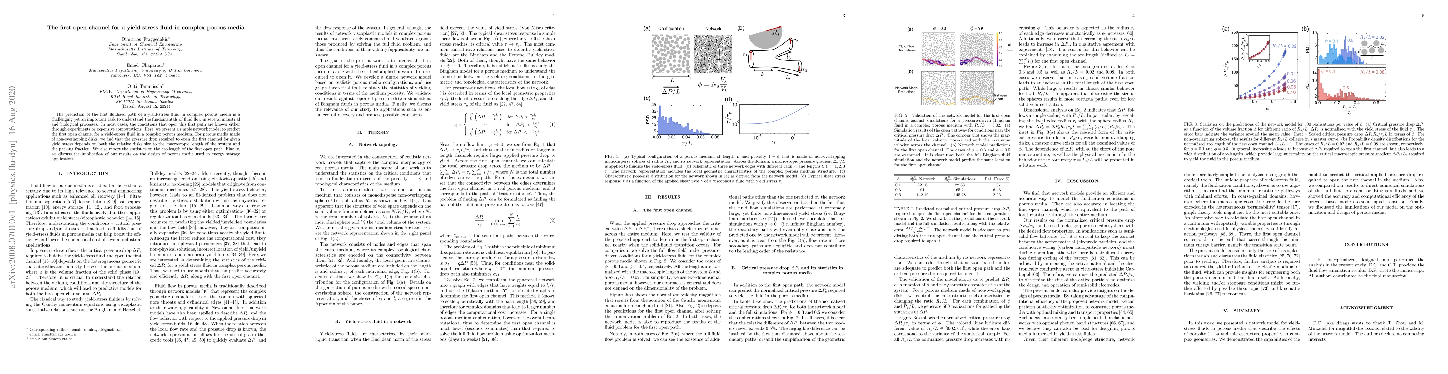 This paper introduces a simple network model to predict the first open channel for yield-stress fluids in complex porous media, finding that the pressure drop required depends on disk size and packing fraction. The study also reports statistics on the arc-length of the first open path and discusses implications for energy storage applications.