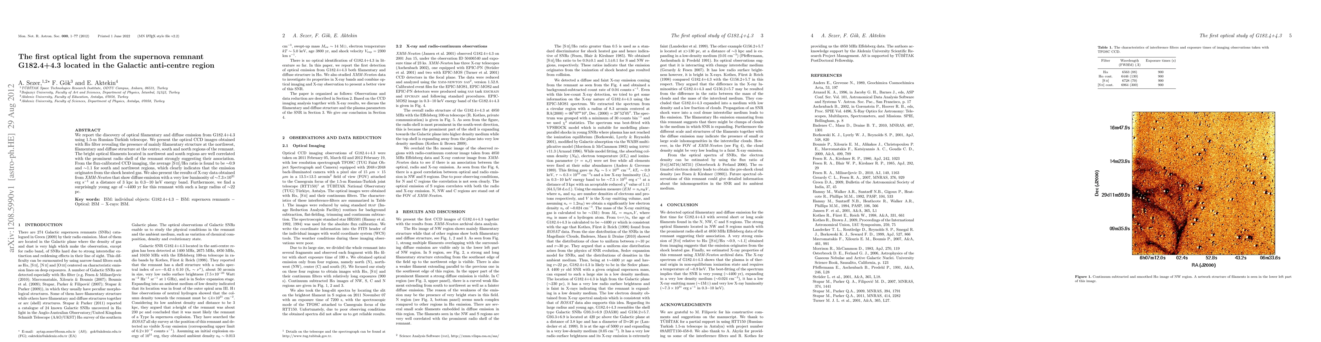 We report the discovery of optical filamentary and diffuse emission from G182.4+4.3 using 1.5-m Russian-Turkish telescope. We present the optical CCD images obtained with Halpha filter revealing the presence of mainly filamentary structure at the northwest, filamentary and diffuse structure at the centre, south and north regions of the remnant. The bright optical filaments located in northwest and south regions are well correlated with the prominent radio shell of the remnant strongly suggesting their association. From the flux-calibrated CCD imaging, the average [SII]/Halpha ratio is found to be ~0.9 and ~1.1 for south and northwest regions, which clearly indicates that the emission originates from the shock heated gas. We also present the results of X-ray data obtained from XMM-Newton that show diffuse emission with a very low luminosity of ~7.3x10^31 erg s^-1 at a distance of 3 kpc in 0.3-10 keV energy band. Furthermore, we find a surprisingly young age of ~4400 yr for this remnant with such a large radius of ~22 pc.