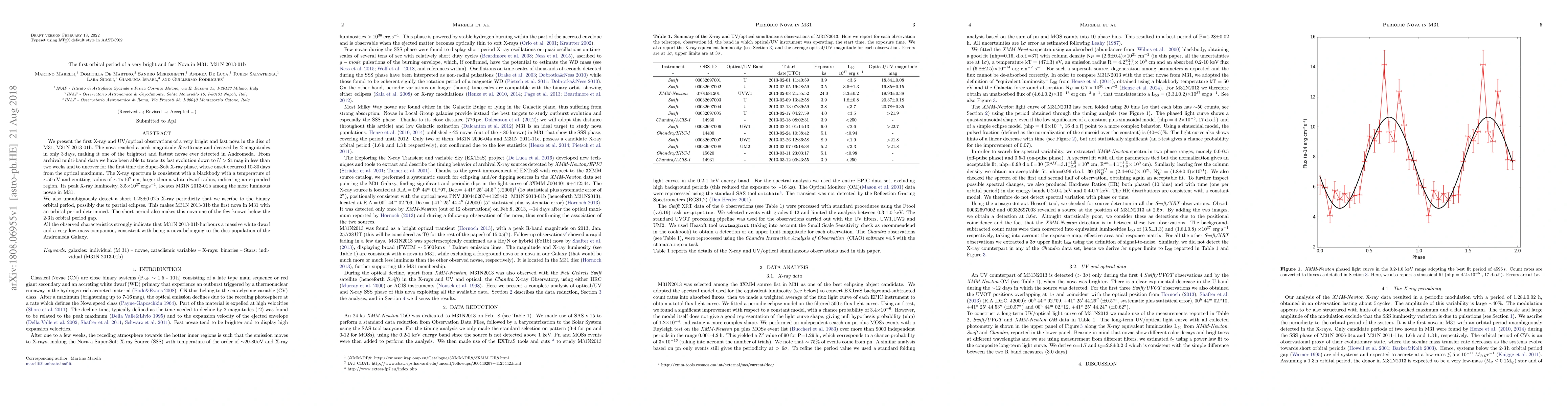 We present the first X-ray and UV/optical observations of a very bright and fast nova in the disc of M31, M31N 2013-01b. The nova reached a peak magnitude $R\sim$15 mag and decayed by 2 magnitudes in only 3 days, making it one of the brightest and fastest novae ever detected in Andromeda. From archival multi-band data we have been able to trace its fast evolution down to $U>21$ mag in less than two weeks and to uncover for the first time the Super-Soft X-ray phase, whose onset occurred 10-30 days from the optical maximum. The X-ray spectrum is consistent with a blackbody with a temperature of $\sim$50 eV and emitting radius of $\sim$4$\times 10^{9}$ cm, larger than a white dwarf radius, indicating an expanded region. Its peak X-ray luminosity, 3.5$\times 10^{37}$ erg s$^{-1}$, locates M31N 2013-01b among the most luminous novae in M31. We also unambiguously detect a short 1.28$\pm$0.02 h X-ray periodicity that we ascribe to the binary orbital period, possibly due to partial eclipses. This makes M31N 2013-01b the first nova in M31 with an orbital period determined. The short period also makes this nova one of the few known below the 2-3 h orbital period gap. All the observed characteristics strongly indicate that M31N 2013-01b harbours a massive white dwarf and a very low-mass companion, consistent with being a nova belonging to the disc population of the Andromeda Galaxy.