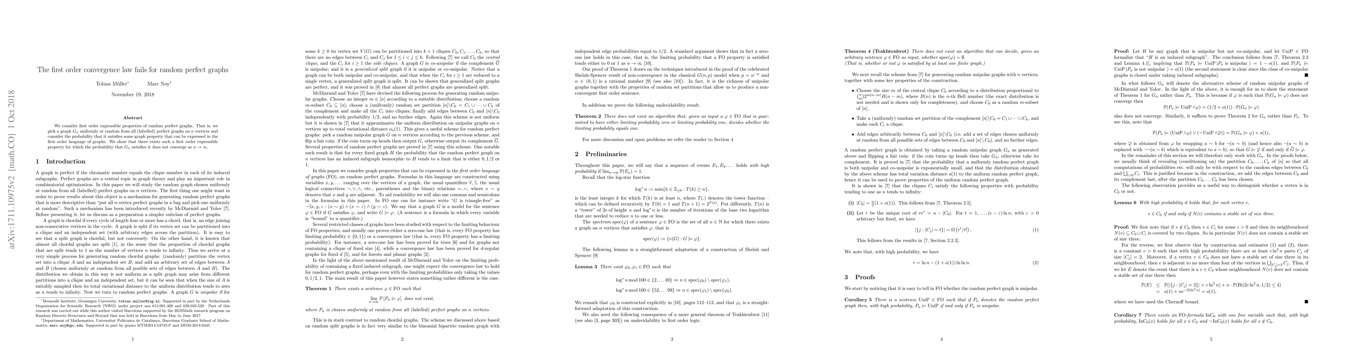 Summary: This paper demonstrates that first order convergence laws do not hold for random perfect graphs, showing that the probability of a randomly chosen perfect graph on $n$ vertices satisfying a specific first-order expressible property does not converge as $n$ approaches infinity.