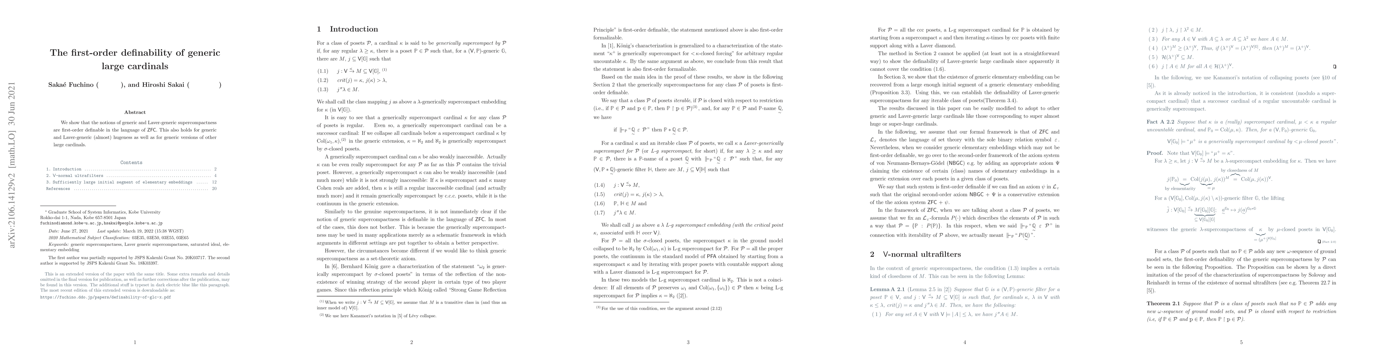 This paper demonstrates that the concepts of generic and Laver-generic supercompactness, along with generic versions of (almost) hugeness and other large cardinals, are first-order definable within the framework of ZFC. The findings reveal the inherent logical structure of these advanced cardinal characteristics.