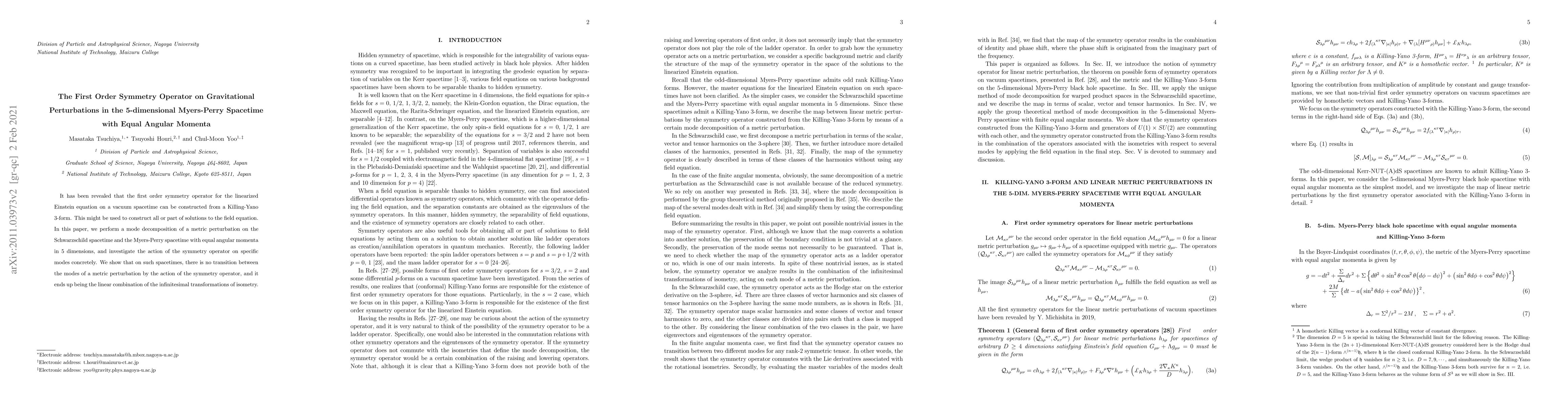 Researchers show that a symmetry operator for gravitational perturbations in 5-dimensional Myers-Perry spacetime preserves the structure of metric perturbations, effectively becoming a linear combination of infinitesimal isometric transformations.
