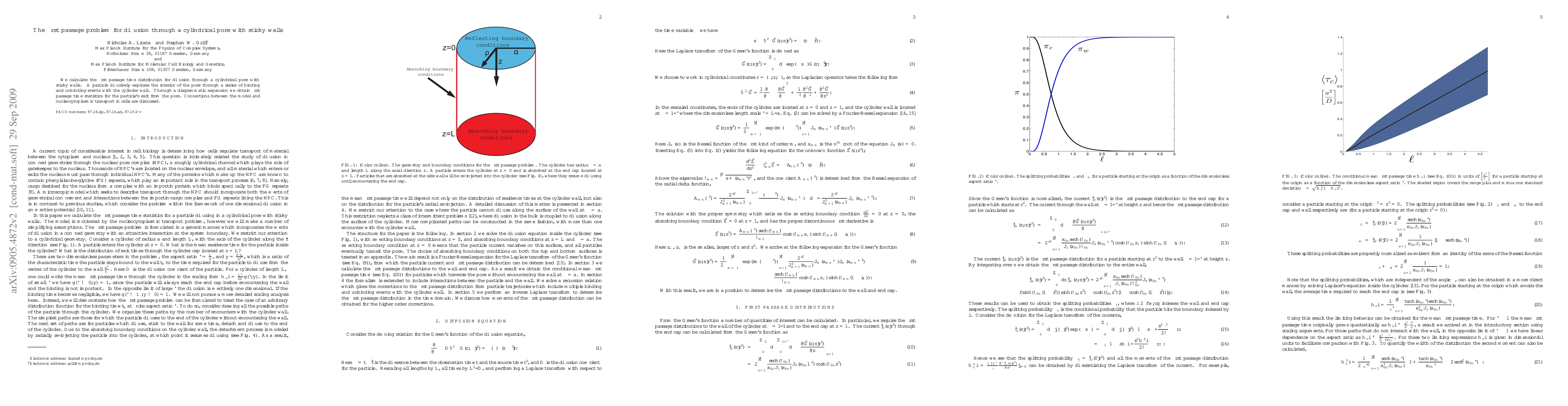 We calculate the first passage time distribution for diffusion through a cylindrical pore with sticky walls. A particle diffusively explores the interior of the pore through a series of binding and unbinding events with the cylinder wall. Through a diagrammatic expansion we obtain first passage time statistics for the particle's exit from the pore. Connections between the model and nucleocytoplasmic transport in cells are discussed.