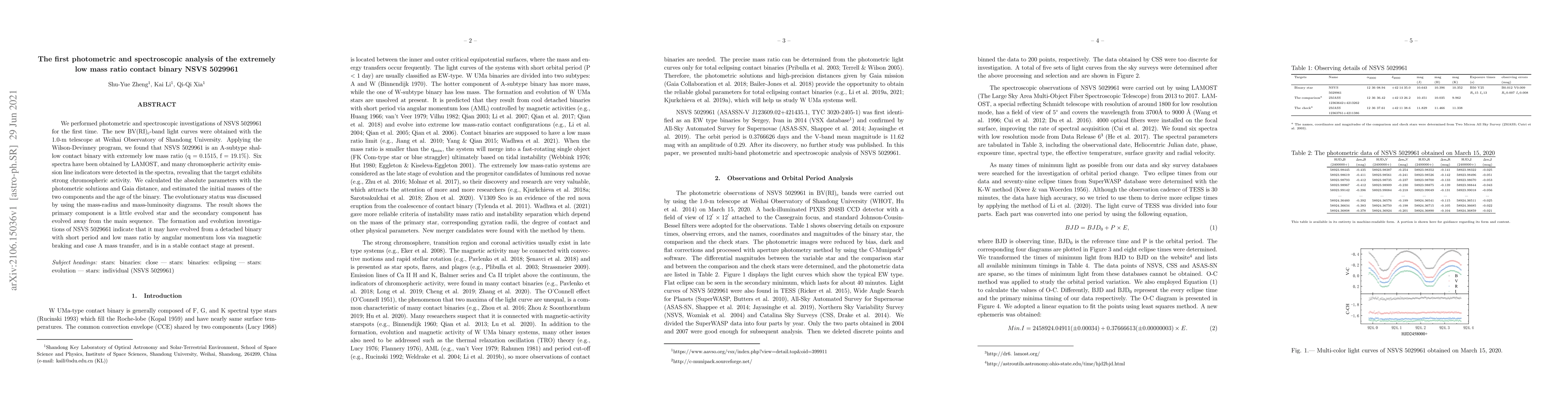 This study presents the first photometric and spectroscopic analysis of the extremely low mass ratio contact binary NSVS 5029961, revealing it to be an A-subtype shallow contact binary with a mass ratio of 0.1515. The analysis indicates strong chromospheric activity, and the evolutionary status suggests it evolved from a detached binary through angular momentum loss and mass transfer.