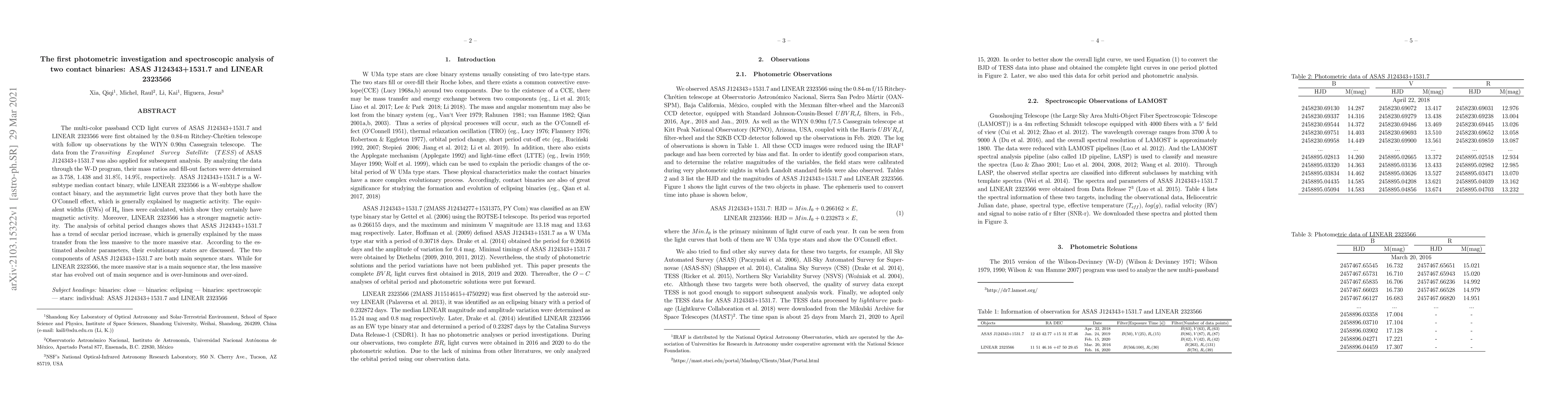 The research investigates two contact binary systems, ASAS J124343+1531.7 and LINEAR 2323566, using light curves from telescopes including TESS. Mass ratios, fill-out factors, and evidence of magnetic activity via H$_alpha$ lines were determined. ASAS J124343+1531.7 shows a secular period increase, suggesting mass transfer. Its components are main sequence stars. LINEAR 2323566 comprises a main sequence star and an evolved, over-luminous, over-sized star.