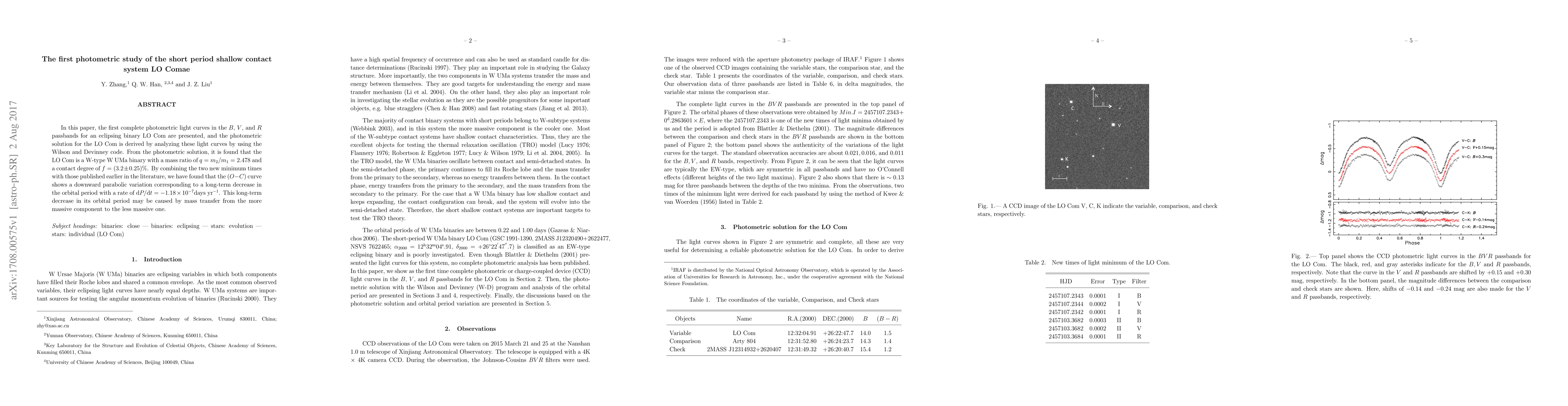 In this paper, the first complete photometric light curves in the B, V, and R passbands for an eclipsing binary LO Com are presented, and the photometric solution for the LO Com is derived by analyzing these light curves by using the Wilson and Devinney code. From the photometric solution, it is found that the LO Com is a W-type W UMa binary with a mass ratio of q={m}2/{m}1=2.478 and a contact degree of f=(3.2+/- 0.25) % . By combining the two new minimum times with those published earlier in the literature, we have found that the (O - C) curve shows a downward parabolic variation corresponding to a long-term decrease in the orbital period with a rate of {d}P/{d}t=-1.18*{10}-7 days yr-1. This long-term decrease in its orbital period may be caused by mass transfer from the more massive component to the less massive one.