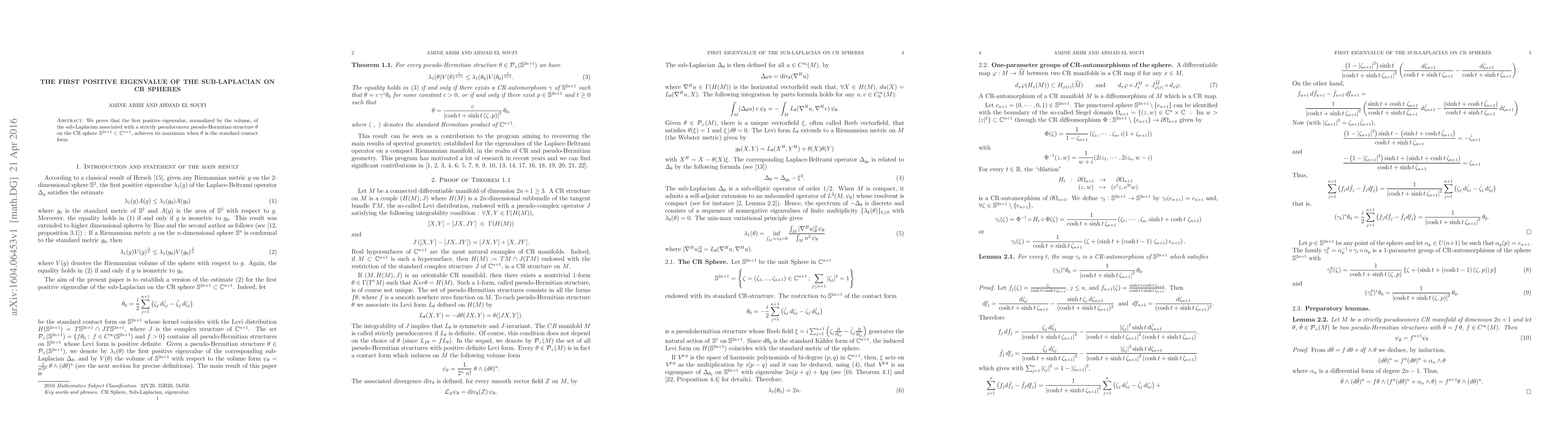 Summary: The paper proves that the first positive eigenvalue of the sub-Laplacian on CR spheres, normalized by volume, reaches its maximum when the pseudo-Hermitian structure is the standard contact form. This result establishes the optimal geometric configuration for this eigenvalue.