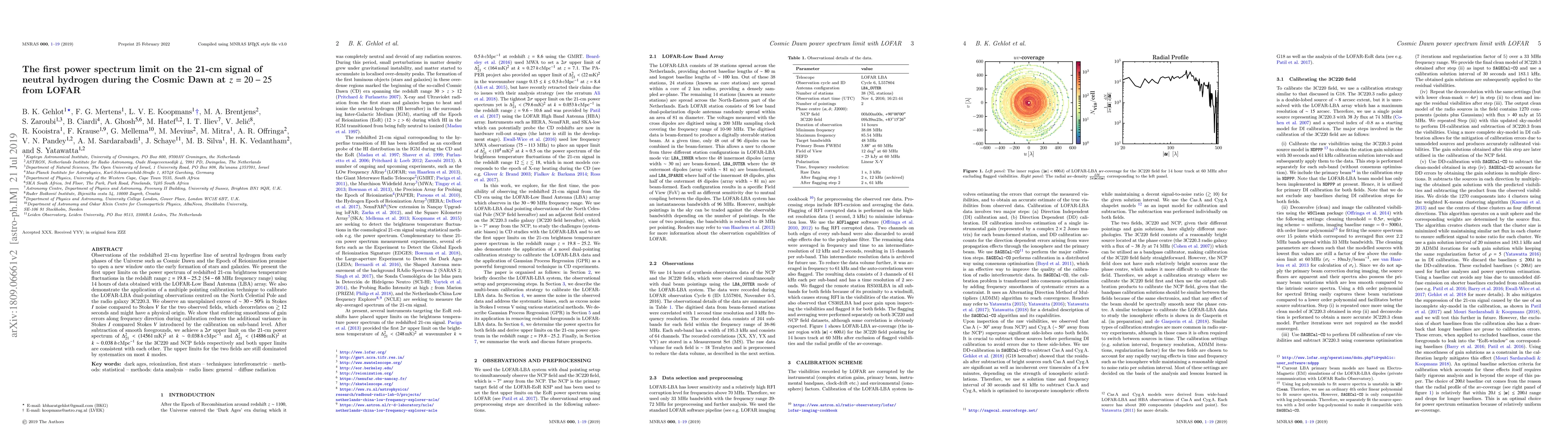 This study presents the first power spectrum limits on the 21-cm signal of neutral hydrogen during the Cosmic Dawn using LOFAR data, achieving a $2\sigma$ upper limit on the power spectrum at $z=20-25$. The research also highlights systematic uncertainties and an unexplained noise excess in the observations.