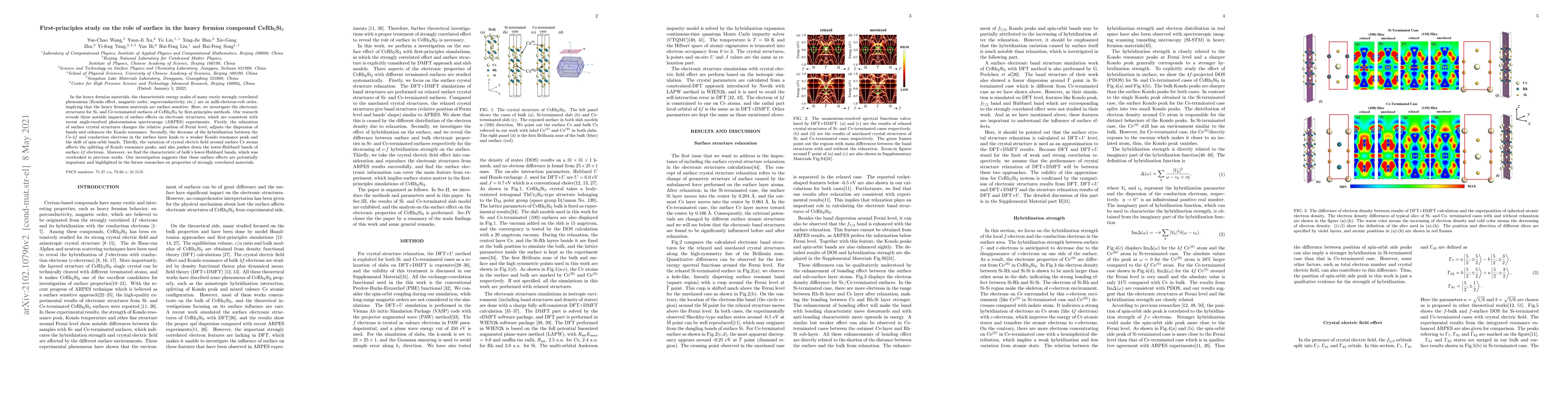 This study uses first-principles methods to analyze the electronic structures of CeRh$_2$Si$_2$'s Si- and Ce-terminated surfaces, revealing three key surface effects: altered Fermi level position, weaker Kondo resonance due to reduced hybridization, and modified Kondo resonance peak splitting. These findings align with ARPES experiments, suggesting significant surface sensitivity in heavy fermion materials' properties, which should be considered in future research on strongly correlated materials.