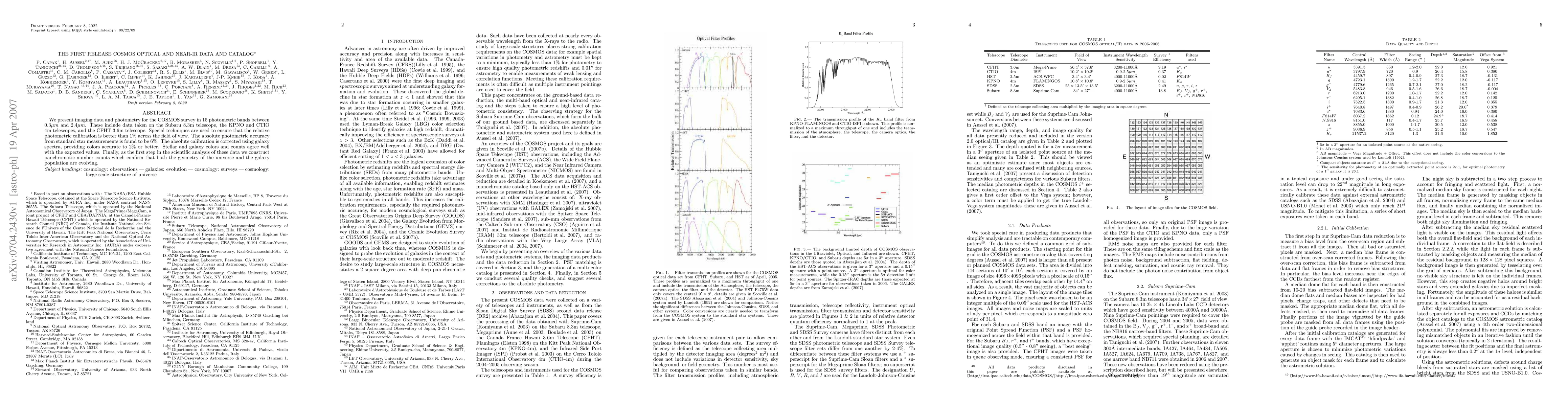 We present imaging data and photometry for the COSMOS survey in 15 photometric bands between 0.3um and 2.4um. These include data taken on the Subaru 8.3m telescope, the KPNO and CTIO 4m telescopes, and the CFHT 3.6m telescope. Special techniques are used to ensure that the relative photometric calibration is better than 1% across the field of view. The absolute photometric accuracy from standard star measurements is found to be 6%. The absolute calibration is corrected using galaxy spectra, providing colors accurate to 2% or better. Stellar and galaxy colors and counts agree well with the expected values. Finally, as the first step in the scientific analysis of these data we construct panchromatic number counts which confirm that both the geometry of the universe and the galaxy population are evolving.