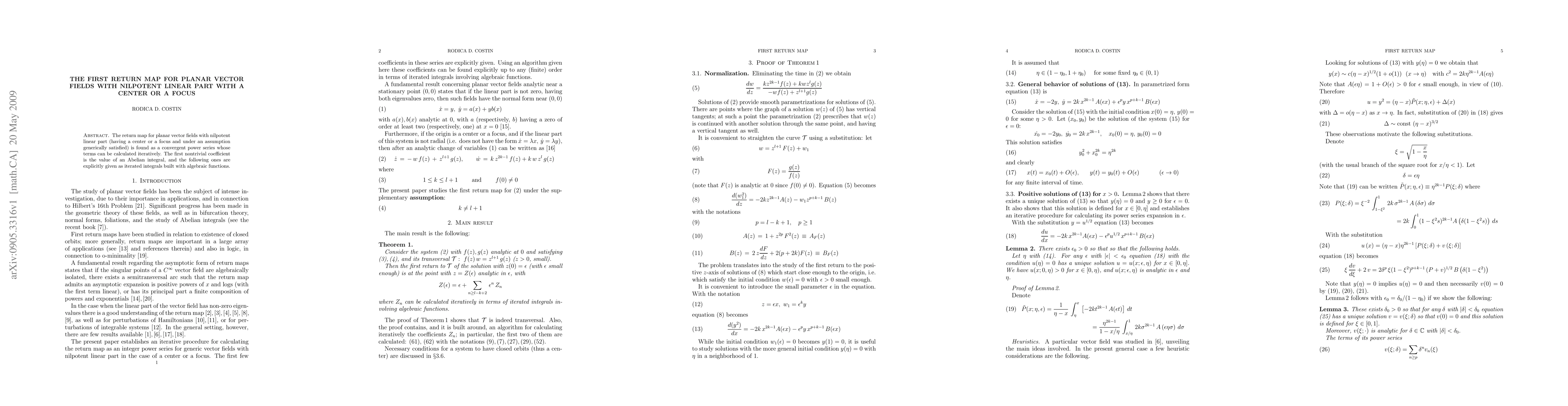 This paper derives the first return map for planar vector fields with a nilpotent linear part, revealing it as a convergent power series. The first nontrivial coefficient is an Abelian integral, while subsequent coefficients are expressed as iterated integrals involving algebraic functions.