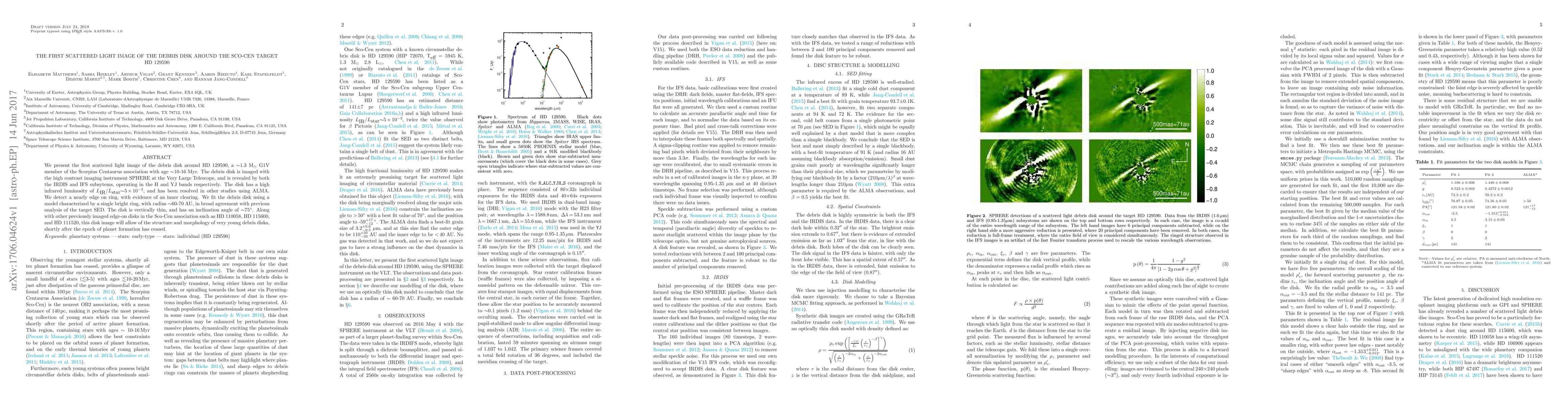 This paper presents the first scattered light image of the debris disk around HD 129590, revealing a nearly edge-on ring with a radius of ~60-70 AU and an inner clearing. The disk, imaged with SPHERE at the VLT, provides insights into the structure of young debris disks in the Sco-Cen association.