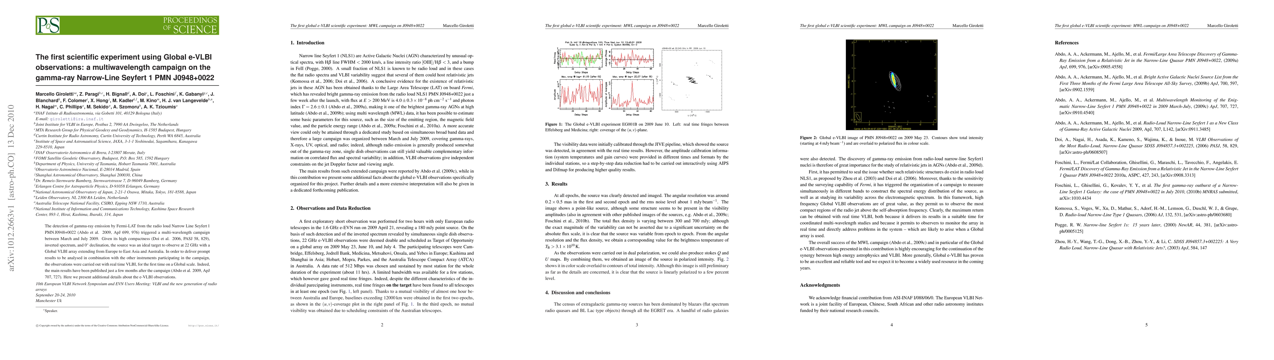 The detection of gamma-ray emission by Fermi-LAT from the radio loud Narrow Line Seyfert 1 PMN J0948+0022 (Abdo et al. 2009, ApJ 699, 976) triggered a multi-wavelength campaign between March and July 2009. Given its high compactness (Doi et al. 2006, PASJ 58, 829), inverted spectrum, and 0deg declination, the source was an ideal target to observe at 22 GHz with a Global VLBI array extending from Europe to East Asia and Australia. In order to deliver prompt results to be analysed in combination with the other instruments participating in the campaign, the observations were carried out with real time VLBI, for the first time on a Global scale. Indeed, the main results have been published just a few months after the campaign (Abdo et al. 2009, ApJ 707, 727). Here we present additional details about the e-VLBI observations.