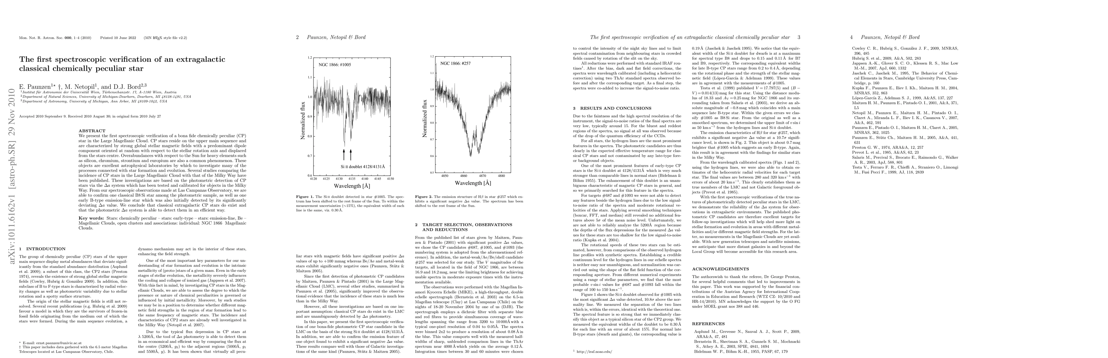 We present the first spectroscopic verification of a bona fide chemically peculiar (CP) star in the Large Magellanic Cloud. CP stars reside on the upper main sequence and are characterized by strong global stellar magnetic fields with a predominant dipole component oriented at random with respect to the stellar rotation axis and displaced from the star's centre. Overabundances with respect to the Sun for heavy elements such as silicon, chromium, strontium and europium are also a common phenomenon. These objects are excellent astrophysical laboratories by which to investigate many of the processes connected with star formation and evolution. Several studies comparing the incidence of CP stars in the Large Magellanic Cloud with that of the Milky Way have been published. These investigations are based on the photometric detection of CP stars via the Delta a system which has been tested and calibrated for objects in the Milky Way. From our spectroscopic observations made at Las Campanas Observatory, we are able to confirm one classical B8 Si star among the photometric sample, as well as one early B-type emission-line star which was also initially detected by its significantly deviating Delta a value. We conclude that classical extragalactic CP stars do exist and that the photometric Delta a system is able to detect them in an efficient way.