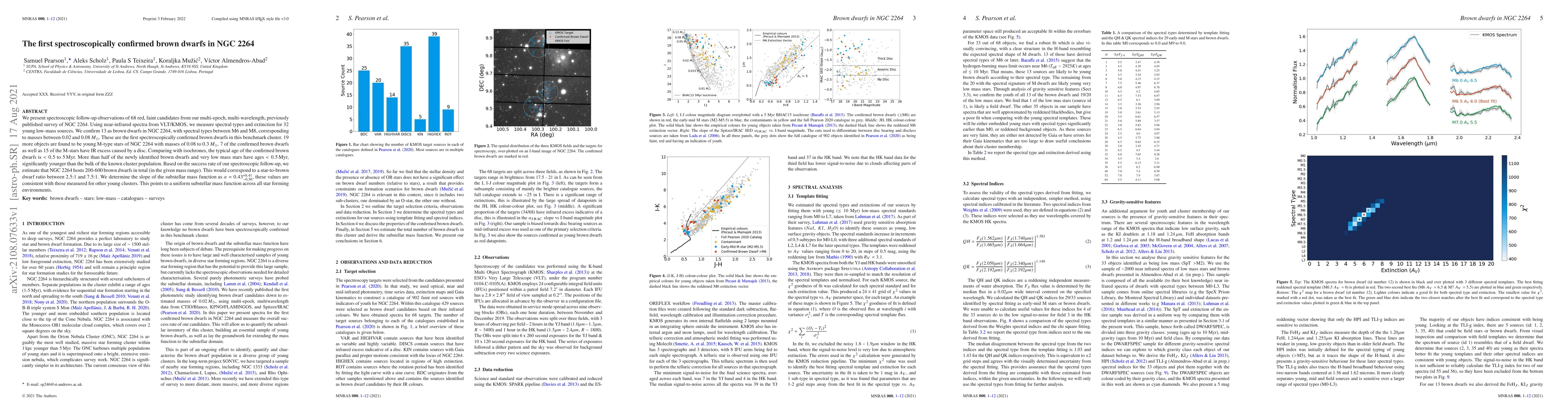 We present spectroscopic follow-up observations of 68 red, faint candidates from our multi-epoch, multi-wavelength, previously published survey of NGC 2264. Using near-infrared spectra from VLT/KMOS, we measure spectral types and extinction for 32 young low-mass sources. We confirm 13 as brown dwarfs in NGC 2264, with spectral types between M6 and M8, corresponding to masses between 0.02 and 0.08$M_{\odot}$. These are the first spectroscopically confirmed brown dwarfs in this benchmark cluster. 19 more objects are found to be young M-type stars of NGC 2264 with masses of 0.08 to 0.3$\,M_{\odot}$. 7 of the confirmed brown dwarfs as well as 15 of the M-stars have IR excess caused by a disc. Comparing with isochrones, the typical age of the confirmed brown dwarfs is $<$0.5 to 5Myr. More than half of the newly identified brown dwarfs and very low mass stars have ages $<$0.5Myr, significantly younger than the bulk of the known cluster population. Based on the success rate of our spectroscopic follow-up, we estimate that NGC 2264 hosts 200-600 brown dwarfs in total (in the given mass range). This would correspond to a star-to-brown dwarf ratio between 2.5:1 and 7.5:1. We determine the slope of the substellar mass function as $\alpha = 0.43^{+0.41}_{-0.56}$, these values are consistent with those measured for other young clusters. This points to a uniform substellar mass function across all star forming environments.