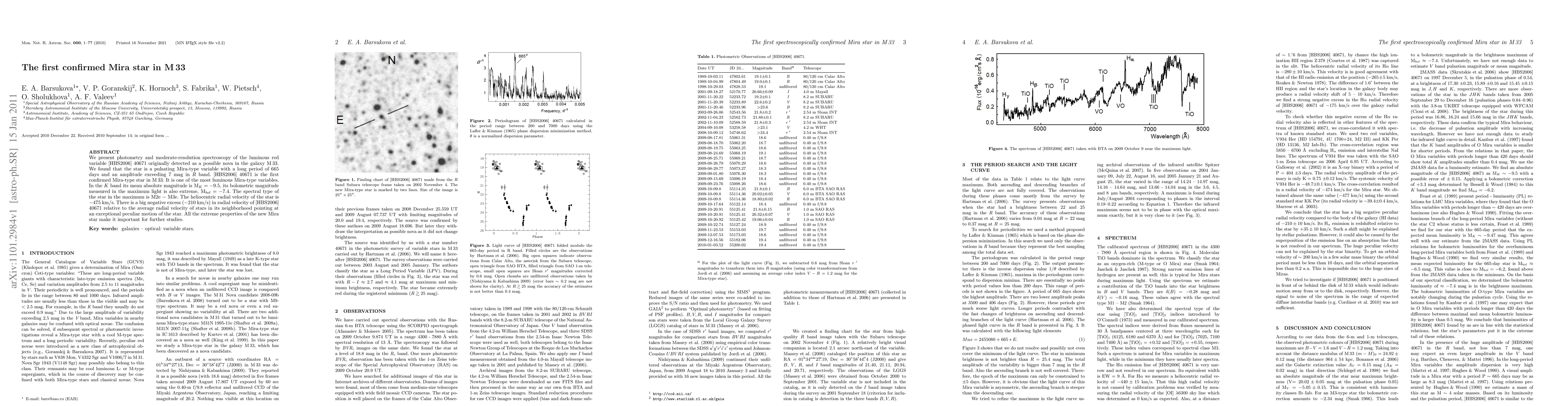 This paper identifies [HBS2006] 40671 as the first spectroscopically confirmed Mira star in M33, characterized by a long 665-day pulsation period and extreme luminosity, making it significant for further astronomical studies. Its peculiar radial velocity suggests an exceptional motion relative to its neighborhood.