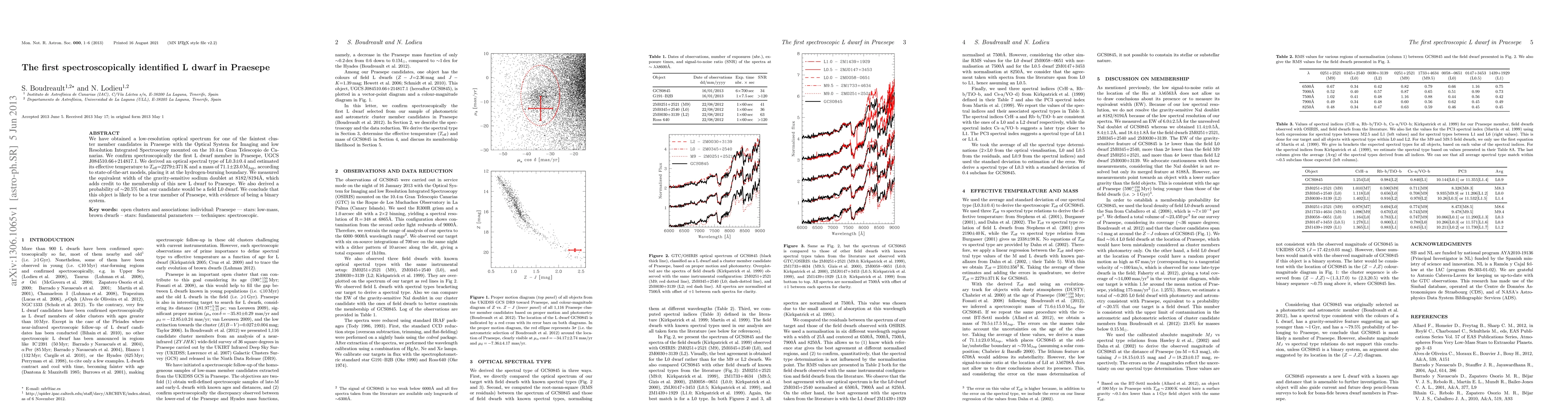 This study identifies UGCS J084510.66+214817.1 as the first spectroscopically confirmed L dwarf in the Praesepe cluster, with an optical spectral type of L0.3 and an effective temperature of 2279 K, suggesting it lies on the hydrogen-burning boundary. The object shows a 20.5% chance of being a field L0 dwarf, but evidence strongly supports its membership in Praesepe and hints at a possible binary system.