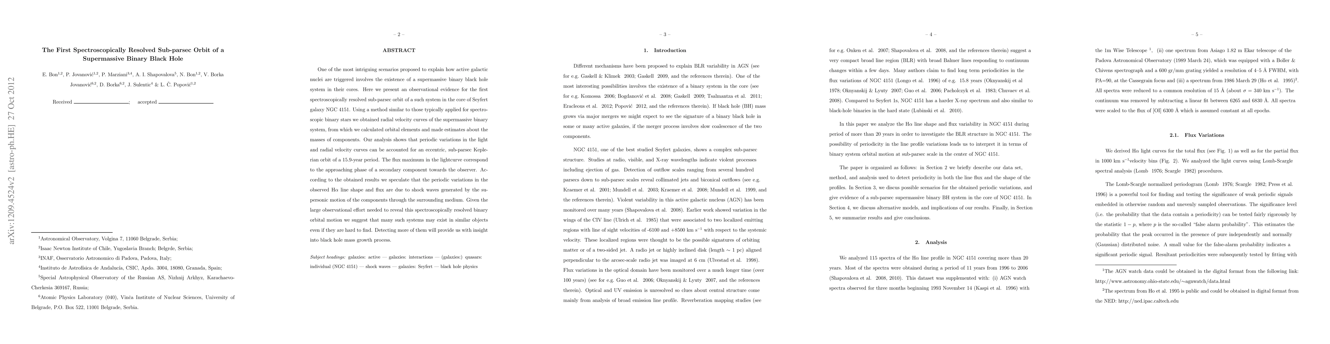 This paper presents the first spectroscopically resolved sub-parsec orbit of a supermassive binary black hole in the core of NGC 4151, revealing an eccentric 15.9-year orbit. The study suggests that periodic variations in light and radial velocity are due to shock waves from the black holes' supersonic motion.