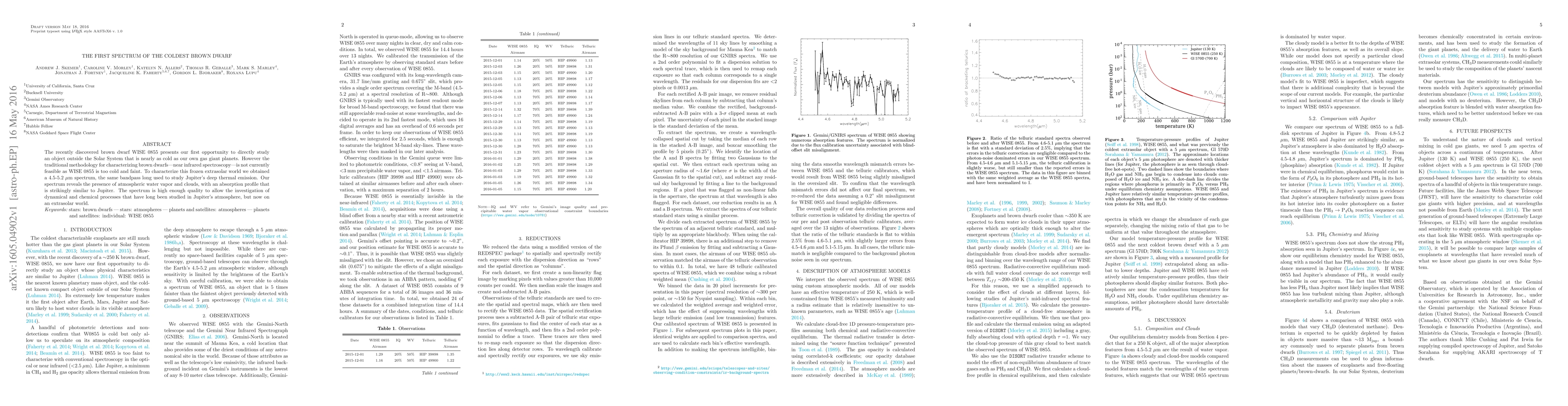 This paper presents the first spectrum of the coldest brown dwarf WISE 0855, revealing atmospheric water vapor and clouds similar to Jupiter's. The study utilizes a 4.5-5.2 µm spectrum to characterize this faint object, enabling the investigation of dynamical and chemical processes on an extrasolar world.