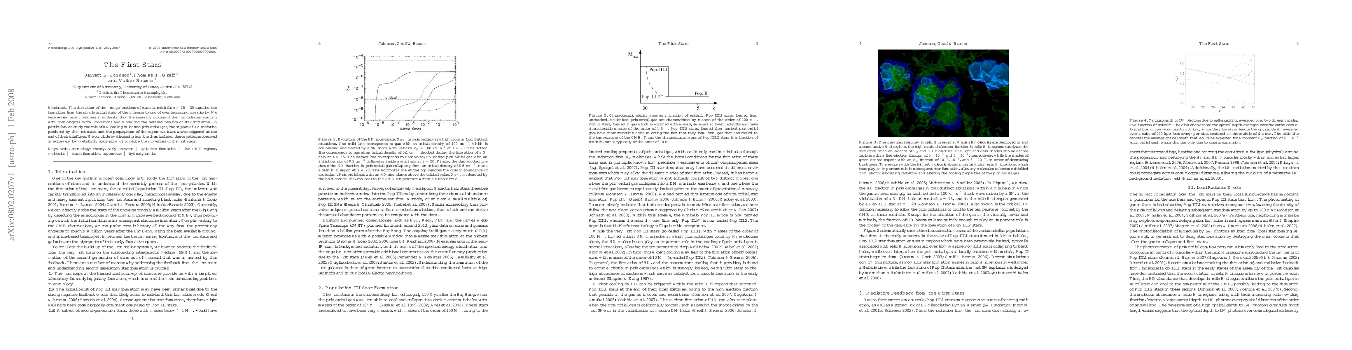 The formation of the first generations of stars at redshifts z > 15-20 signaled the transition from the simple initial state of the universe to one of increasing complexity. We here review recent progress in understanding the assembly process of the first galaxies, starting with cosmological initial conditions and modelling the detailed physics of star formation. In particular, we study the role of HD cooling in ionized primordial gas, the impact of UV radiation produced by the first stars, and the propagation of the supernova blast waves triggered at the end of their brief lives. We conclude by discussing how the chemical abundance patterns observed in extremely low-metallicity stars allow us to probe the properties of the first stars.