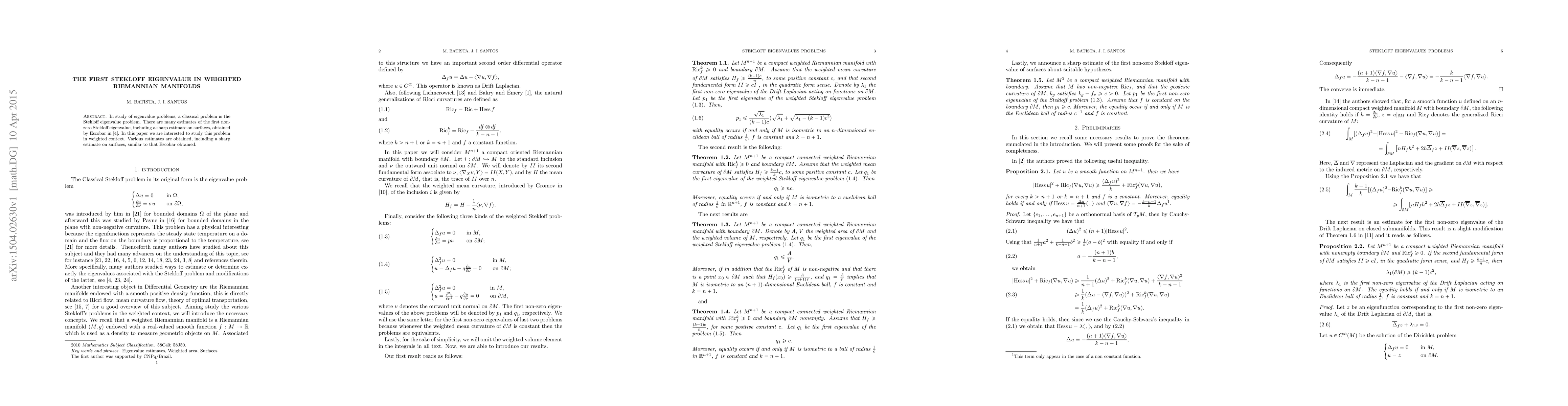 This paper investigates the Stekloff eigenvalue problem in weighted Riemannian manifolds, focusing on obtaining estimates for the first non-zero eigenvalue, including a sharp estimate on surfaces analogous to Escobar's classical result.