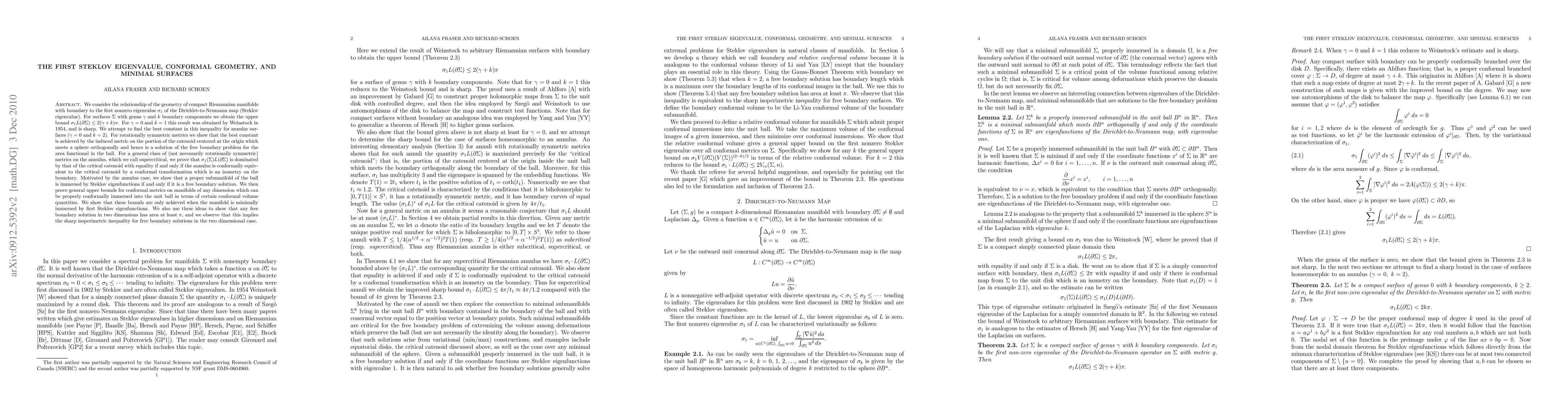 We consider the relationship of the geometry of compact Riemannian manifolds with boundary to the first nonzero eigenvalue sigma_1 of the Dirichlet-to-Neumann map (Steklov eigenvalue). For surfaces Sigma with genus gamma and k boundary components we obtain the upper bound sigma_1L(\partial \Sigma) \leq 2(2gamma+k)\pi. We attempt to find the best constant in this inequality for annular surfaces (gamma=0 and k=2). For rotationally symmetric metrics we show that the best constant is achieved by the induced metric on the portion of the catenoid centered at the origin which meets a sphere orthogonally and hence is a solution of the free boundary problem for the area functional in the ball. For a general class of (not necessarily rotationally symmetric) metrics on the annulus, which we call supercritical, we prove that $\sigma_1(\sig)L(\p\Sigma)$ is dominated by that of the critical catenoid with equality if and only if the annulus is conformally equivalent to the critical catenoid by a conformal transformation which is an isometry on the boundary. We prove general upper bounds for conformal metrics on manifolds of any dimension which can be properly conformally immersed into the unit ball in terms of certain conformal volume quantities. We show that these bounds are only achieved when the manifold is minimally immersed by first Steklov eigenfunctions. We also use these ideas to show that any free boundary solution in two dimensions has area at least \pi.