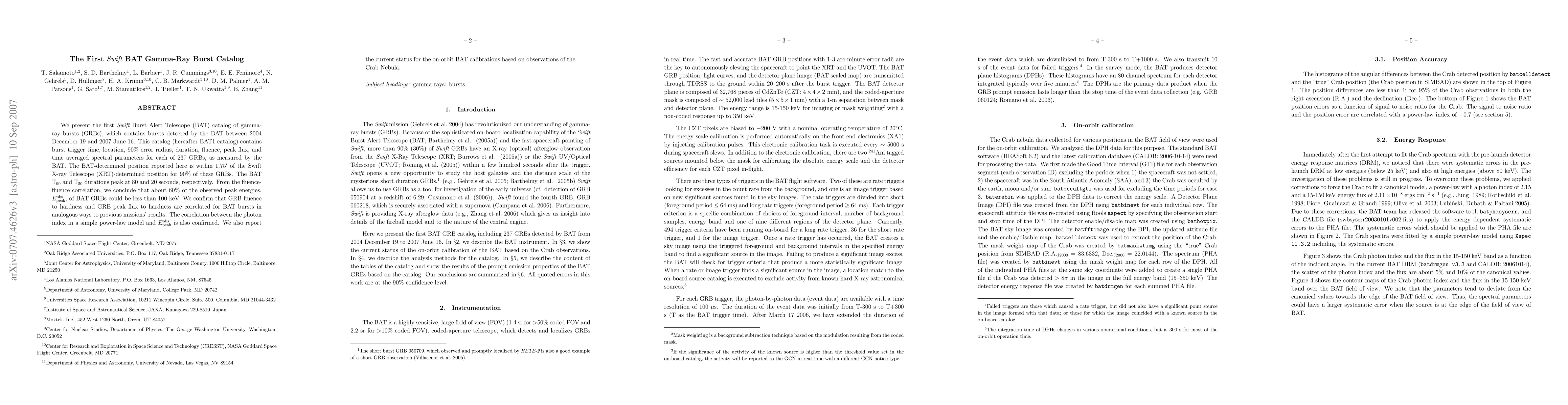 The first Swift BAT gamma-ray burst catalog (BAT1) includes 237 GRBs detected from December 2004 to June 2007, providing detailed burst parameters and confirming correlations between fluence, peak flux, and hardness ratios. The BAT-determined positions match closely with Swift XRT-determined positions.