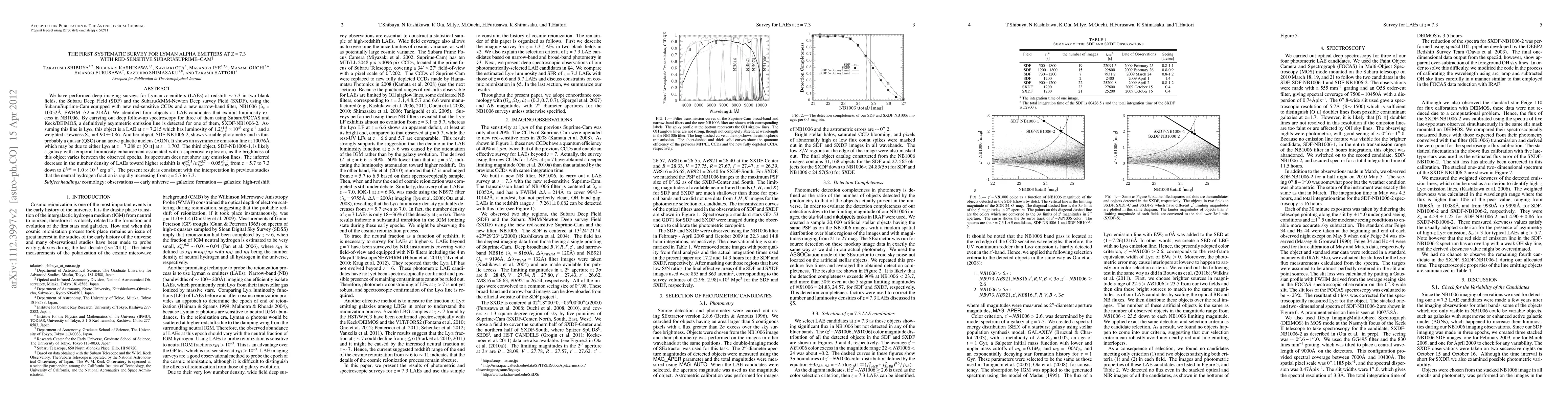 This study conducted deep imaging surveys for Lyman Alpha Emitters (LAEs) at z=7.3 using Subaru/Suprime-Cam, identifying four LAE candidates. Follow-up spectroscopy confirmed the presence of an asymmetric emission line in one candidate, SXDF-NB1006-2, indicating it as a LAE at z=7.215. The study suggests a decrease in LAE number density towards higher redshifts, consistent with increasing neutral hydrogen fractions.