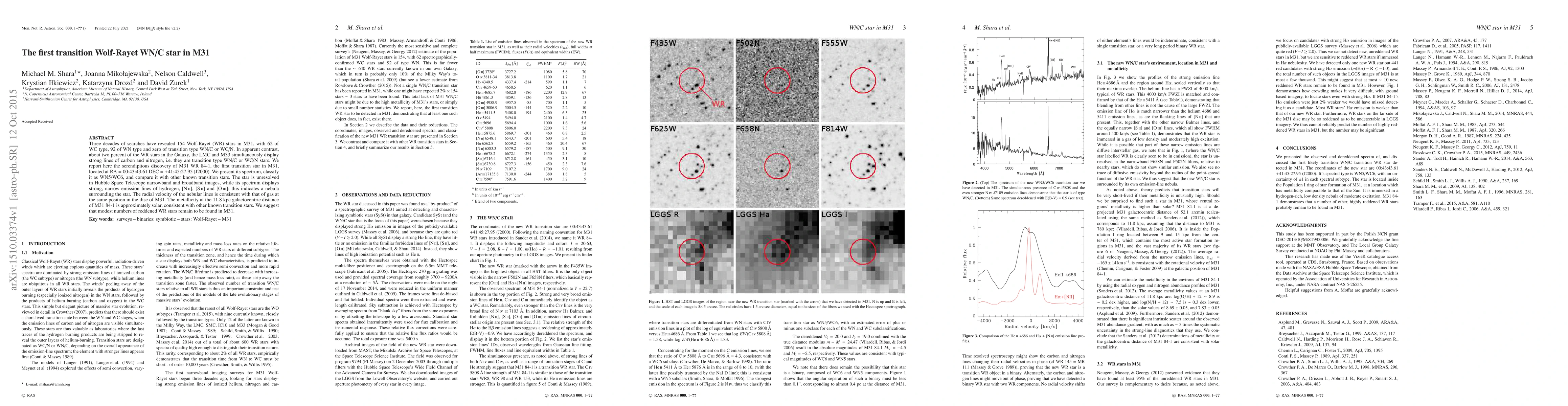 The first transition Wolf-Rayet star WN/C in M31, M31 WR 84-1, has been discovered, classified as WN5/WC6, and found to exhibit strong emission lines indicating a surrounding nebula. This discovery suggests that more reddened WR stars may exist in M31.