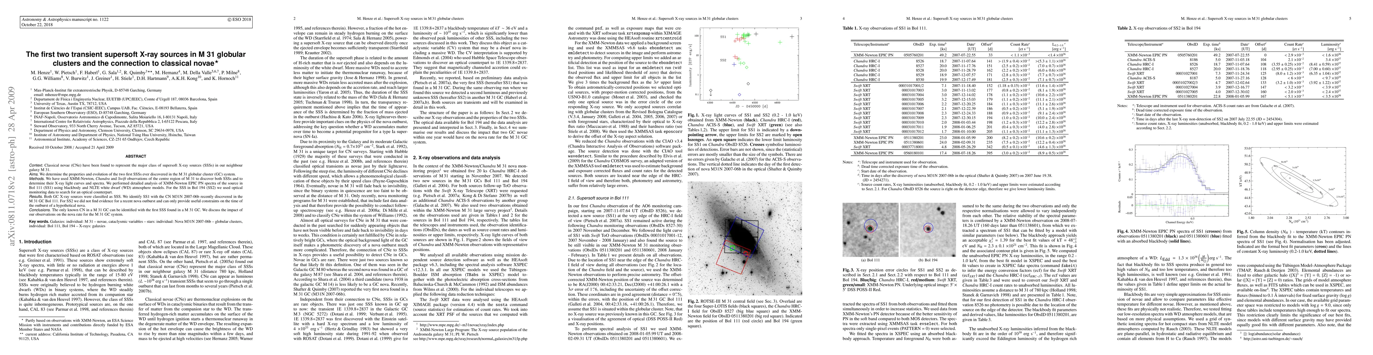 Classical novae (CNe) have been found to represent the major class of supersoft X-ray sources (SSS) in our neighbour galaxy M 31. We determine properties and evolution of the two first SSSs ever discovered in the M 31 globular cluster (GC) system. We have used XMM-Newton, Chandra and Swift observations of the centre region of M 31 to discover both SSS and to determine their X-ray light curves and spectra. We performed detailed analysis of XMM-Newton EPIC PN spectra of the source in Bol 111 (SS1) using blackbody and NLTE white dwarf (WD) atmosphere models. For the SSS in Bol 194 (SS2) we used optical monitoring data to search for an optical counterpart. Both GC X-ray sources were classified as SSS. We identify SS1 with the CN M31N 2007-06b recently discovered in the M 31 GC Bol 111. For SS2 we did not find evidence for a recent nova outburst and can only provide useful constraints on the time of the outburst of a hypothetical nova. The only known CN in a M 31 GC can be identified with the first SSS found in a M31 GC. We discuss the impact of our observations on the nova rate for the M 31 GC system.