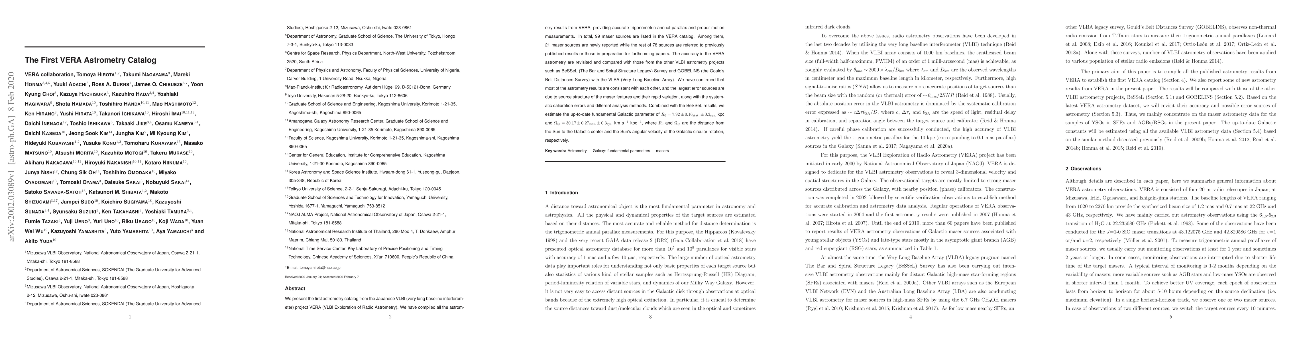 The first VERA astrometry catalog compiles accurate trigonometric parallax and proper motion measurements for 99 maser sources, with 21 newly reported. The catalog's accuracy is compared with other VLBI projects, confirming consistency despite error sources like source structure and rapid variations. The combined results estimate updated Galactic parameters: $R_{0}=7.92\pm0.16$ kpc and $\Omega_{\odot}=30.17\pm0.27$ km~s$^{-1}$~kpc$^{-1}$.