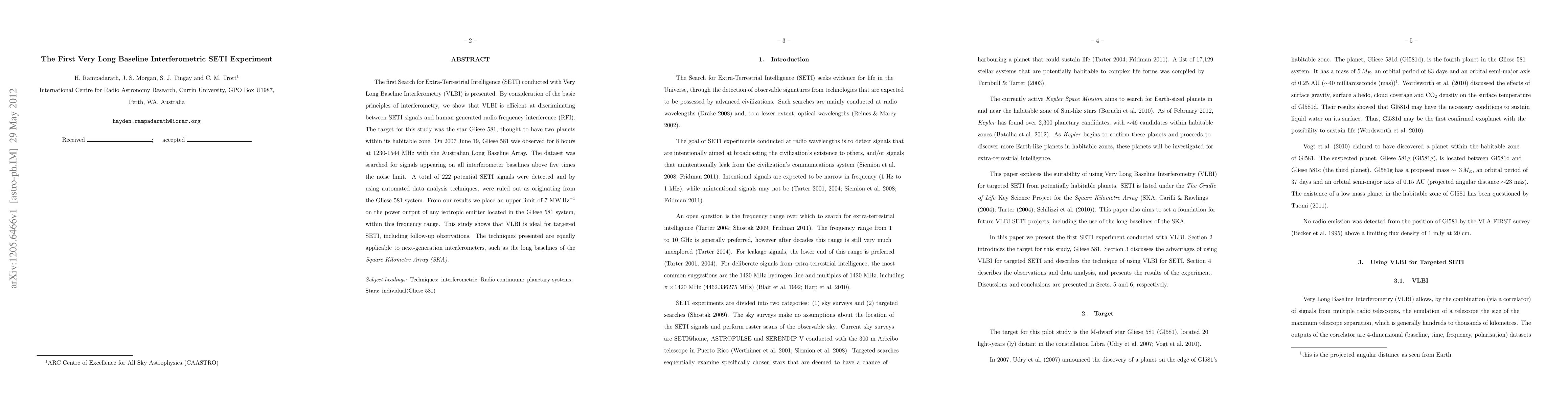 This paper reports the first SETI experiment using Very Long Baseline Interferometry (VLBI), observing the star Gliese 581 for 8 hours to detect potential extraterrestrial signals. Despite detecting 222 potential signals, none were confirmed as originating from the star system, establishing an upper limit of 7 MW/Hz for any isotropic emitter in the system.