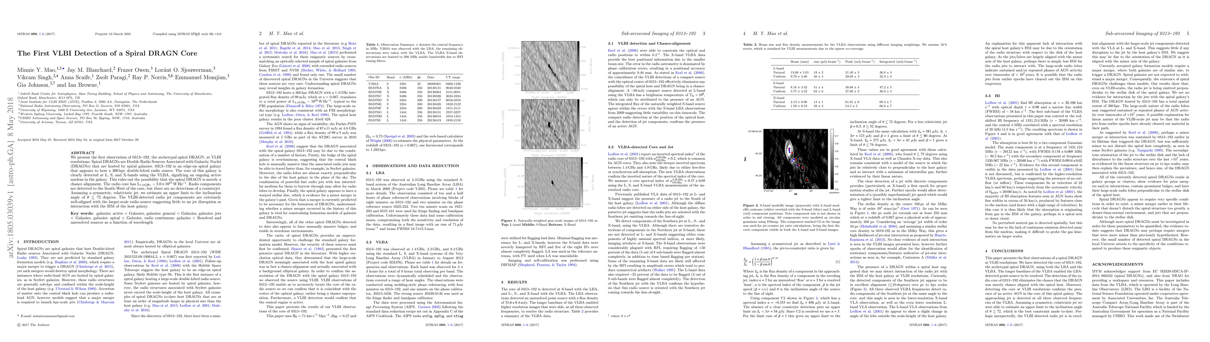 The existence of spiral DRAGNs challenges standard galaxy formation theories. We present the first observation of 0313$-$192, the archetypal spiral DRAGN, at VLBI resolutions. Spiral DRAGNs are Double Radio Sources Associated with Galactic Nuclei (DRAGNs) that are hosted by spiral galaxies. 0313$-$192 is an edge-on spiral galaxy that appears to host a 360 kpc double-lobed radio source. The core of this galaxy is clearly detected at L, S, and X-bands using the VLBA, signifying an ongoing active nucleus in the galaxy. This rules out the possibility that the spiral DRAGN is merely a chance alignment. The radio core has L$_{1.4\,GHz} \sim 3.0 \times 10^{23}$W Hz$^{-1}$. Radio components are detected to the South-West of the core, but there are no detections of a counterjet. Assuming a symmetric, relativistic jet, we estimate an upper limit to the inclination angle of $\theta \lesssim 72$ degrees. The VLBI-detected radio jet components are extremely well-aligned with the larger-scale radio source suggesting little to no jet disruption or interaction with the ISM of the host galaxy.