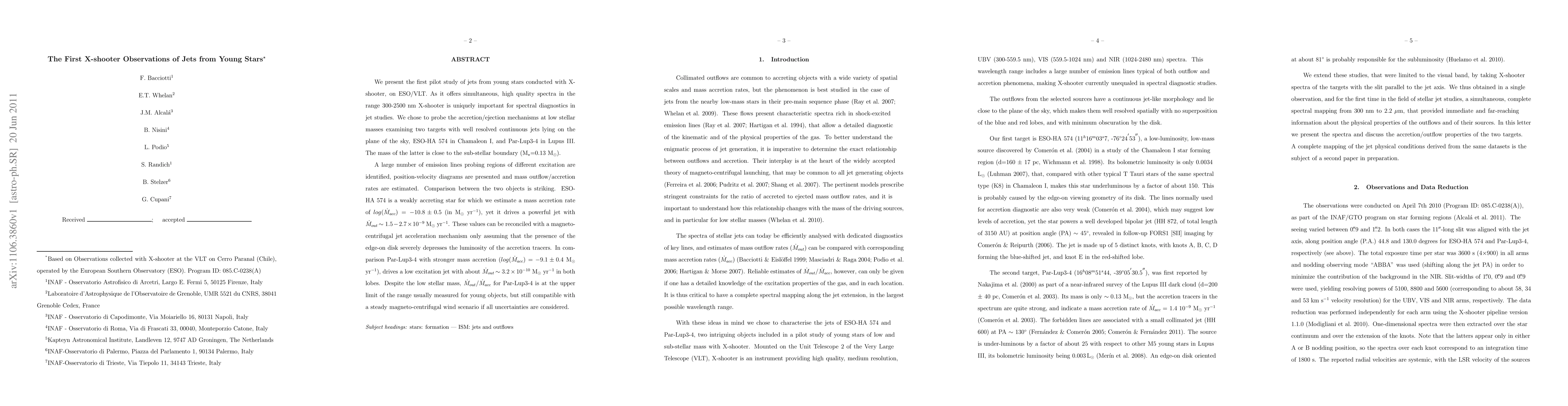 We present the first pilot study of jets from young stars conducted with X-shooter, on ESO/VLT. As it offers simultaneous, high quality spectra in the range 300-2500 nm X-shooter is uniquely important for spectral diagnostics in jet studies. We chose to probe the accretion/ejection mechanisms at low stellar masses examining two targets with well resolved continuous jets lying on the plane of the sky, ESO-HA 574 in Chamaleon I, and Par-Lup3-4 in Lupus III. The mass of the latter is close to the sub-stellar boundary (Mstar=0.13 Msun). A large number of emission lines probing regions of different excitation are identified, position-velocity diagrams are presented and mass outflow/accretion rates are estimated. Comparison between the two objects is striking. ESO-HA 574 is a weakly accreting star for which we estimate a mass accretion rate of log(\dot{Macc}) = -10.8 \pm 0.5 (in Msun/yr), yet it drives a powerful jet with \dot{Mout} ~ 1.5-2.7 10^-9 Msun/yr. These values can be reconciled with a magneto-centrifugal jet acceleration mechanism only assuming that the presence of the edge-on disk severely depresses the luminosity of the accretion tracers. In comparison Par-Lup3-4 with stronger mass accretion (log(\dot{Macc}) = -9.1 \pm 0.4 Msun/yr), drives a low excitation jet with about \dot{Mout} ~ 3.2 10^-10 Msun/yr in both lobes. Despite the low stellar mass, \dot{Mout} / \dot{Macc} for Par-Lup3-4 is at the upper limit of the range usually measured for young objects, but still compatible with a steady magneto-centrifugal wind scenario if all uncertainties are considered.