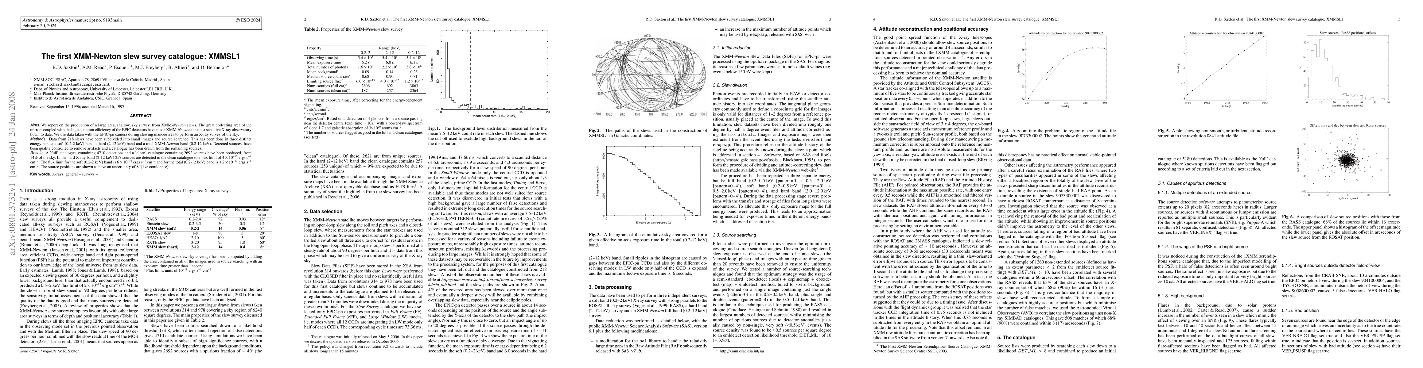 We report on the production of a large area, shallow, sky survey, from XMM-Newton slews. The great collecting area of the mirrors coupled with the high quantum efficiency of the EPIC detectors have made XMM-Newton the most sensitive X-ray observatory flown to date. We use data taken with the EPIC-pn camera during slewing manoeuvres to perform an X-ray survey of the sky. Data from 218 slews have been subdivided into small images and source searched. This has been done in three distinct energy bands; a soft (0.2-2 keV) band, a hard (2-12 keV) band and a total XMM-Newton band (0.2-12 keV). Detected sources, have been quality controlled to remove artifacts and a catalogue has been drawn from the remaining sources. A 'full' catalogue, containing 4710 detections and a 'clean' catalogue containing 2692 sources have been produced, from 14% of the sky. In the hard X-ray band (2-12 keV) 257 sources are detected in the clean catalogue to a flux limit of 4x10^-12 ergs/s/cm2. The flux limit for the soft (0.2-2 keV) band is 6x10^-13 ergs/s/cm2 and for the total (0.2-12 keV) band is 1.2x10^-12 ergs/s/cm2. The source positions are shown to have an uncertainty of 8" (1-sigma confidence).