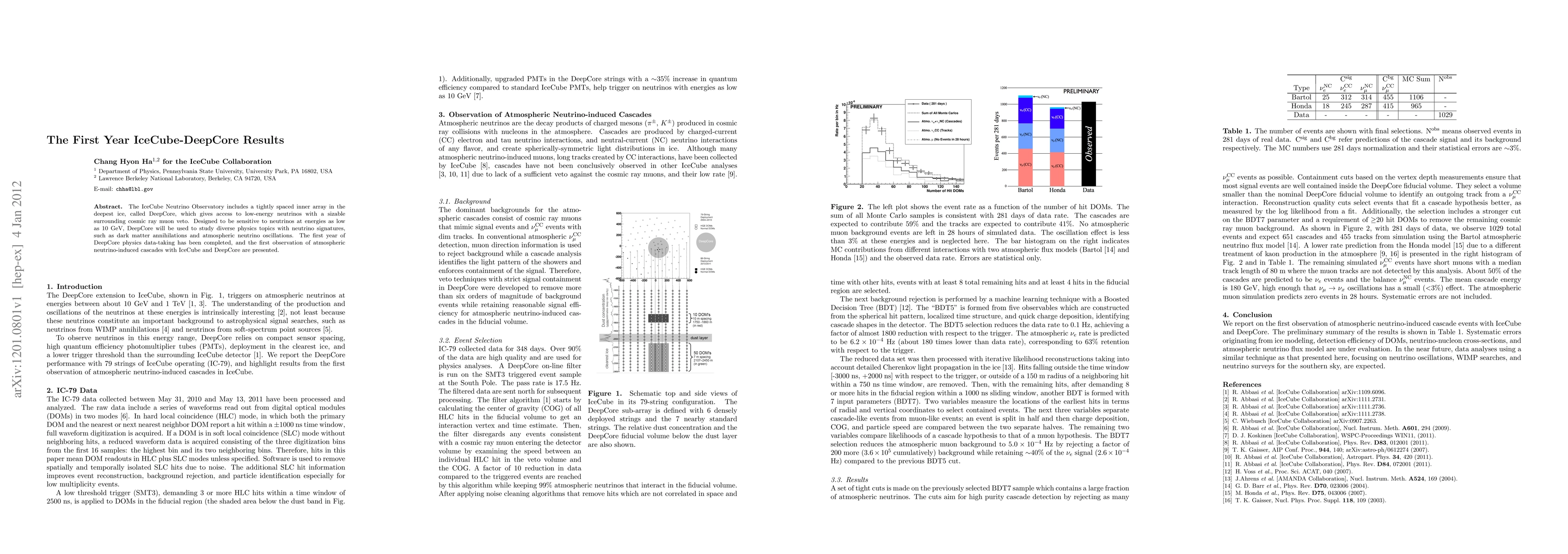 The IceCube-DeepCore observatory detected atmospheric neutrino-induced cascades in its first year, providing valuable data for studying low-energy neutrino interactions and potential dark matter annihilations. This initial observation marks a significant step in neutrino physics research.