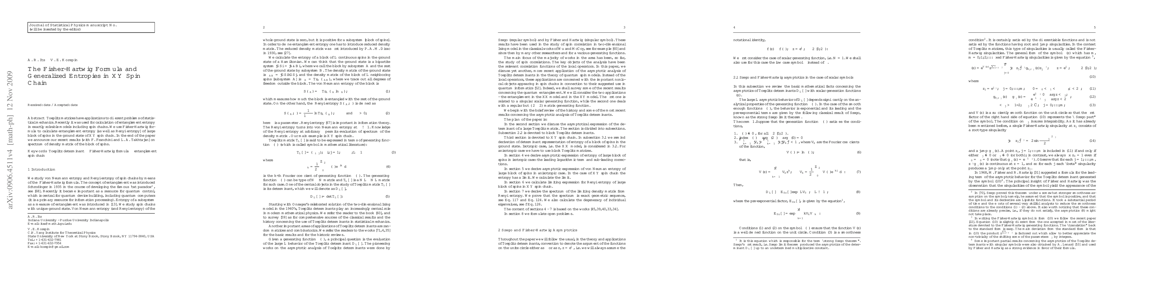 This paper applies the Fisher-Hartwig formula to compute the entanglement entropy in the ground state of an XY spin chain, and also calculates Renyi entropy, proving that the density matrix's spectrum forms an exact geometric sequence with distinct eigenvalue degeneracies.