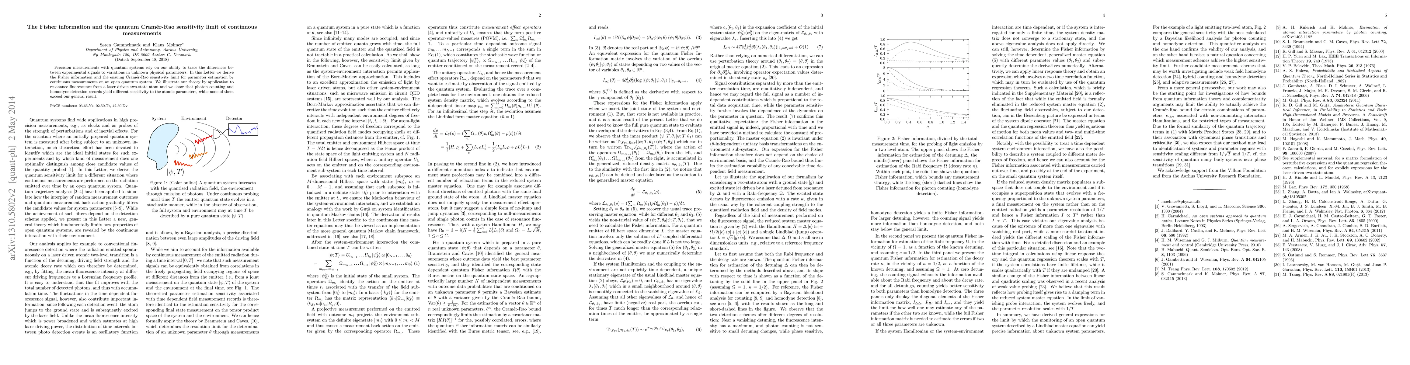 This paper derives the Fisher information and the Cramer-Rao sensitivity limit for parameter estimation in continuous quantum measurements, applying the theory to resonance fluorescence from a laser-driven two-state atom. It finds that photon counting and homodyne detection have different sensitivities but do not exceed the derived general limit.