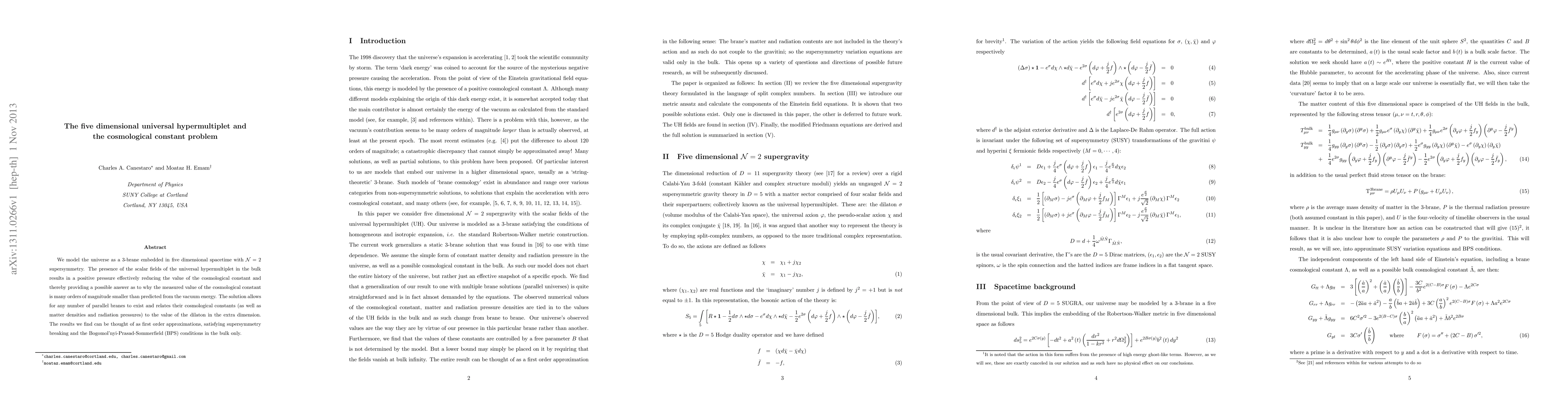 We model the universe as a 3-brane embedded in five dimensional spacetime with N=2 supersymmetry. The presence of the scalar fields of the universal hypermultiplet in the bulk results in a positive pressure effectively reducing the value of the cosmological constant and thereby providing a possible answer as to why the measured value of the cosmological constant is many orders of magnitude smaller than predicted from the vacuum energy. The solution allows for any number of parallel branes to exist and relates their cosmological constants (as well as matter densities and radiation pressures) to the value of the dilaton in the extra dimension. The results we find can be thought of as first order approximations, satisfying supersymmetry breaking and the Bogomol'nyi-Prasad-Sommerfield (BPS) conditions in the bulk only.