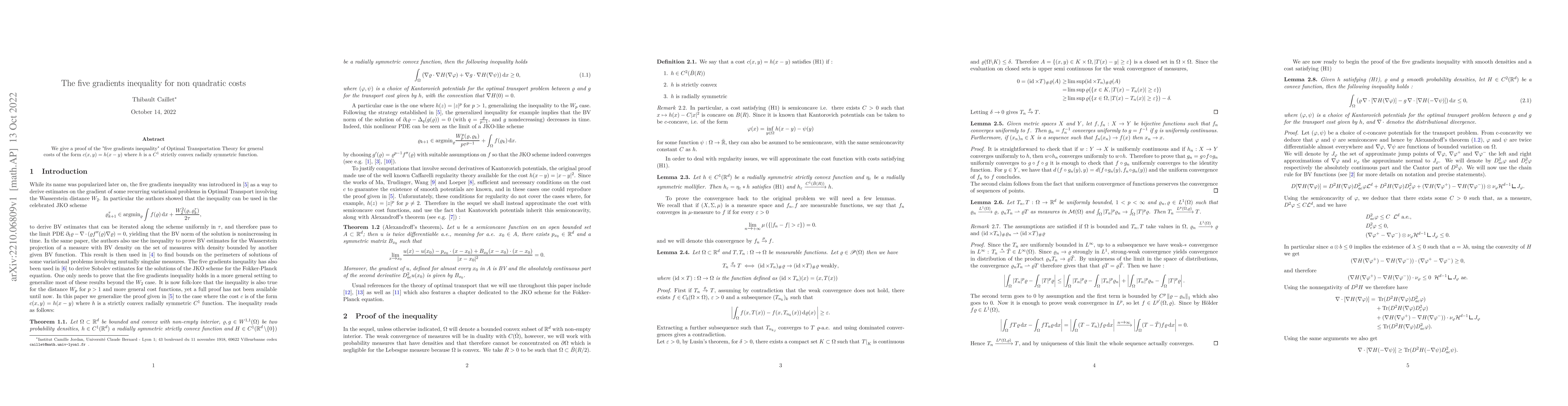 Summary: This paper proves the "five gradients inequality" in Optimal Transportation Theory for non-quadratic costs defined by $c(x,y)=h(x-y)$, where $h$ is a strictly convex, radially symmetric $C^1$ function. The result extends the inequality to a broader class of transportation costs beyond quadratic forms.