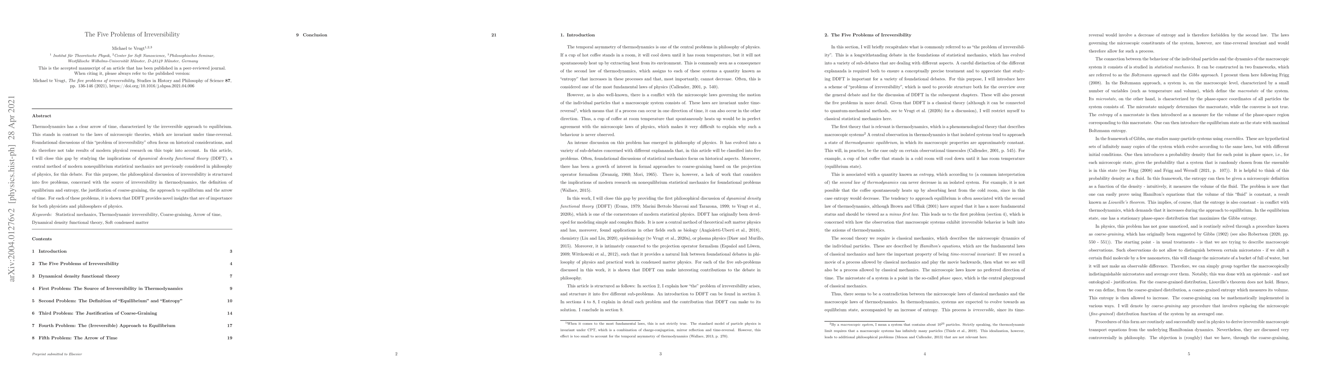 This paper explores five key problems related to thermodynamic irreversibility, using modern dynamical density functional theory (DDFT) to provide new insights. It aims to bridge historical philosophical discussions with contemporary physical research, offering novel perspectives on the source of irreversibility, equilibrium, entropy, coarse-graining, and the arrow of time.