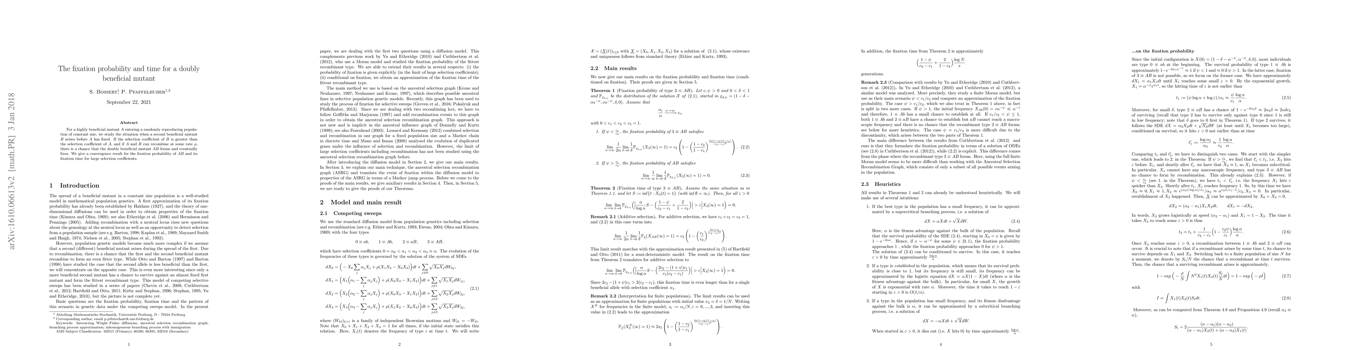 This paper investigates the fixation probability and time for a doubly beneficial mutant $AB$ in a population where a highly beneficial mutant $A$ is already present. It examines the scenario where a second beneficial mutant $B$ emerges before $A$ fixes, focusing on the recombination rate $\rho$ and the relative selection coefficients of $A$ and $B$. The study provides a convergence result for the fixation probability and time of $AB$ when selection coefficients are large.