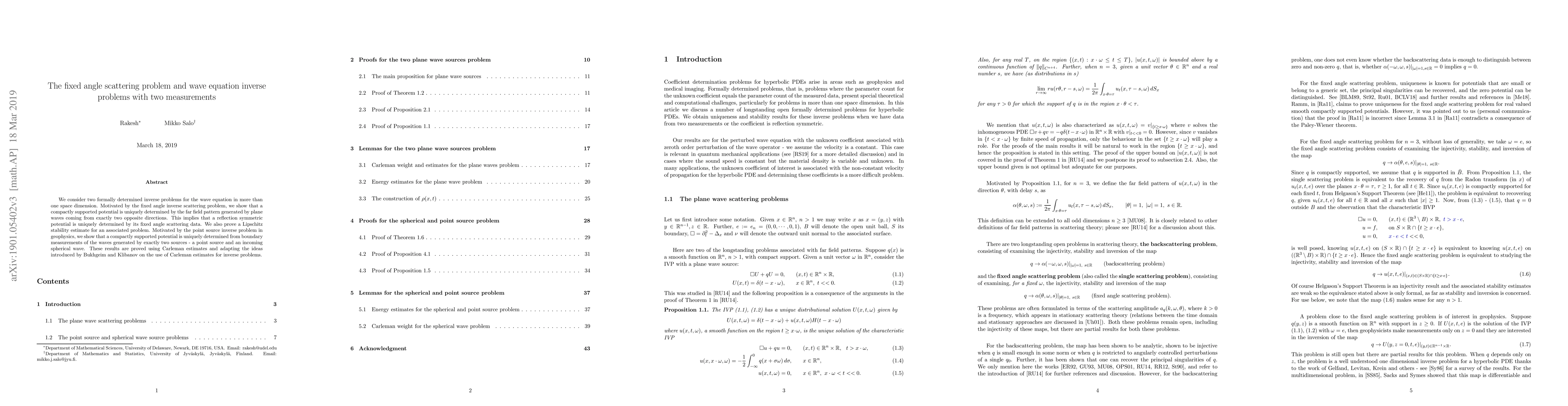 This paper addresses two inverse problems for the wave equation: one based on fixed angle scattering data and another on boundary measurements from two sources, proving uniqueness for both using Carleman estimates and adapting methods from Bukhgeim and Klibanov.