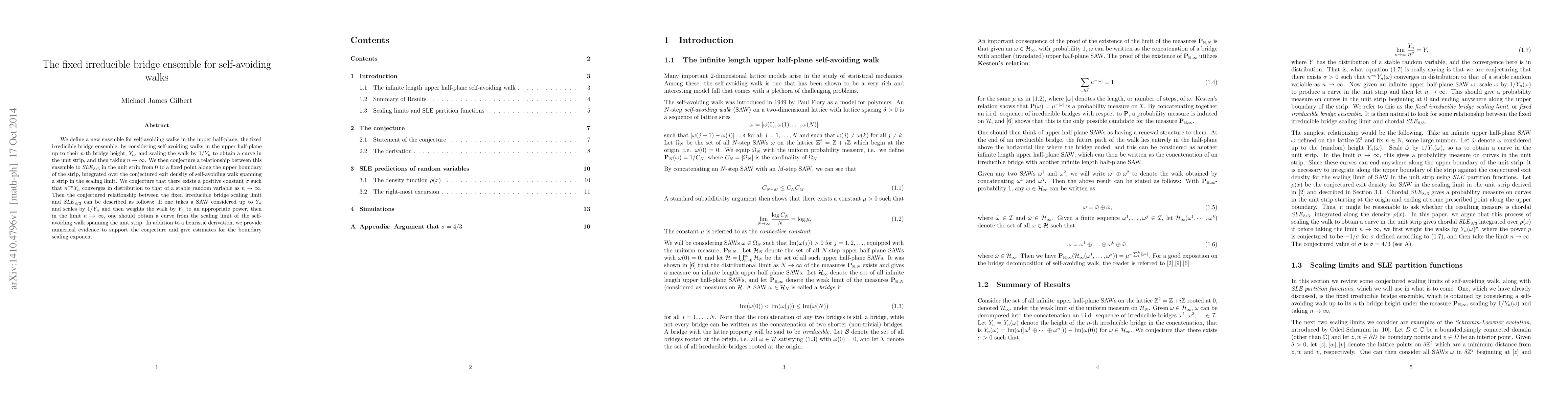 We define a new ensemble for self-avoiding walks in the upper half-plane, the fixed irredicible bridge ensemble, by considering self-avoiding walks in the upper half-plane up to their $n$-th bridge height, $Y_n$, and scaling the walk by $1/Y_n$ to obtain a curve in the unit strip, and then taking $n\to\infty$. We then conjecture a relationship between this ensemble to $\SLE$ in the unit strip from $0$ to a fixed point along the upper boundary of the strip, integrated over the conjectured exit density of self-avoiding walk spanning a strip in the scaling limit. We conjecture that there exists a positive constant $\sigma$ such that $n^{-\sigma}Y_n$ converges in distribution to that of a stable random variable as $n\to\infty$. Then the conjectured relationship between the fixed irreducible bridge scaling limit and $\SLE$ can be described as follows: If one takes a SAW considered up to $Y_n$ and scales by $1/Y_n$ and then weights the walk by $Y_n$ to an appropriate power, then in the limit $n\to\infty$, one should obtain a curve from the scaling limit of the self-avoiding walk spanning the unit strip. In addition to a heuristic derivation, we provide numerical evidence to support the conjecture and give estimates for the boundary scaling exponent.
