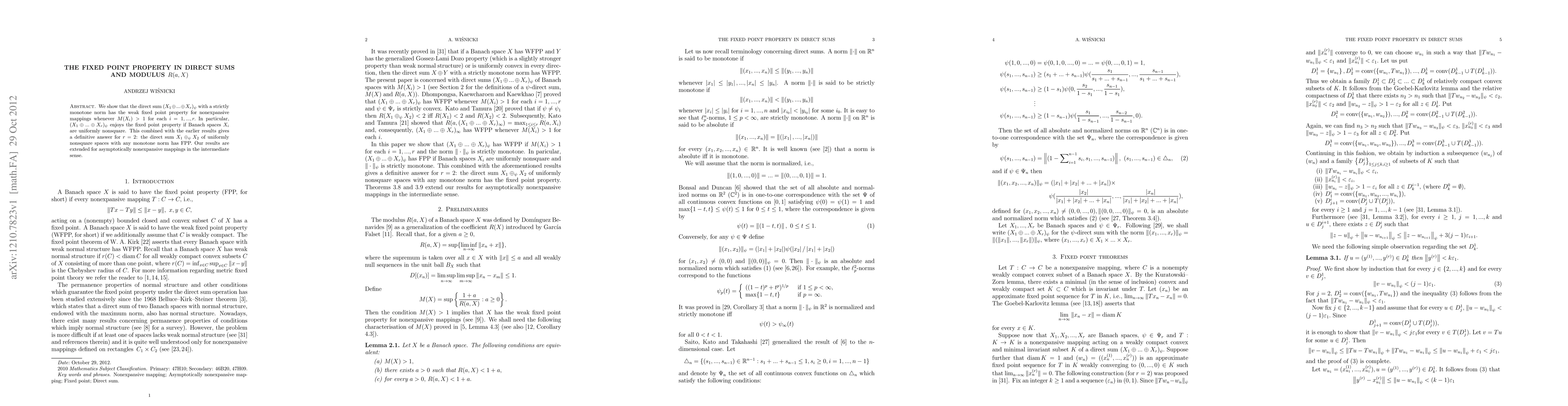 This paper demonstrates that the direct sum of Banach spaces with a strictly monotone norm and modulus R(a,X) greater than 1 possesses the weak fixed point property for nonexpansive mappings. It confirms the fixed point property for uniformly nonsquare spaces and extends the results to asymptotically nonexpansive mappings.