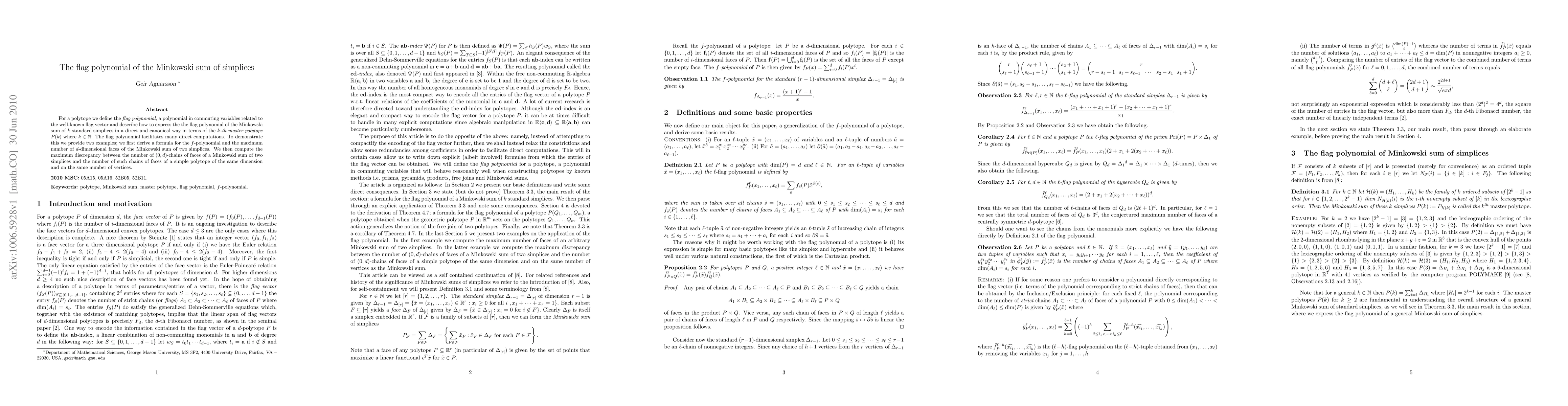 For a polytope we define the {\em flag polynomial}, a polynomial in commuting variables related to the well-known flag vector and describe how to express the the flag polynomial of the Minkowski sum of $k$ standard simplices in a direct and canonical way in terms of the {\em $k$-th master polytope} $P(k)$ where $k\in\nats$. The flag polynomial facilitates many direct computations. To demonstrate this we provide two examples; we first derive a formula for the $f$-polynomial and the maximum number of $d$-dimensional faces of the Minkowski sum of two simplices. We then compute the maximum discrepancy between the number of $(0,d)$-chains of faces of a Minkowski sum of two simplices and the number of such chains of faces of a simple polytope of the same dimension and on the same number of vertices.